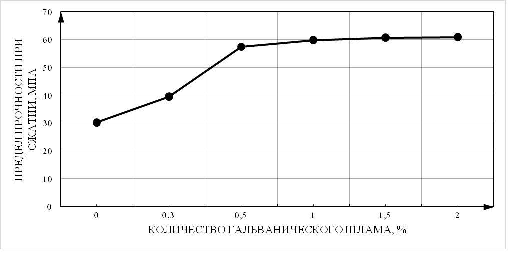 Кристаллизация стекломассы приводит к повышению прочности. Зависимость предела прочности при сжатии от количества гальваношлама показана на рис. 2.
