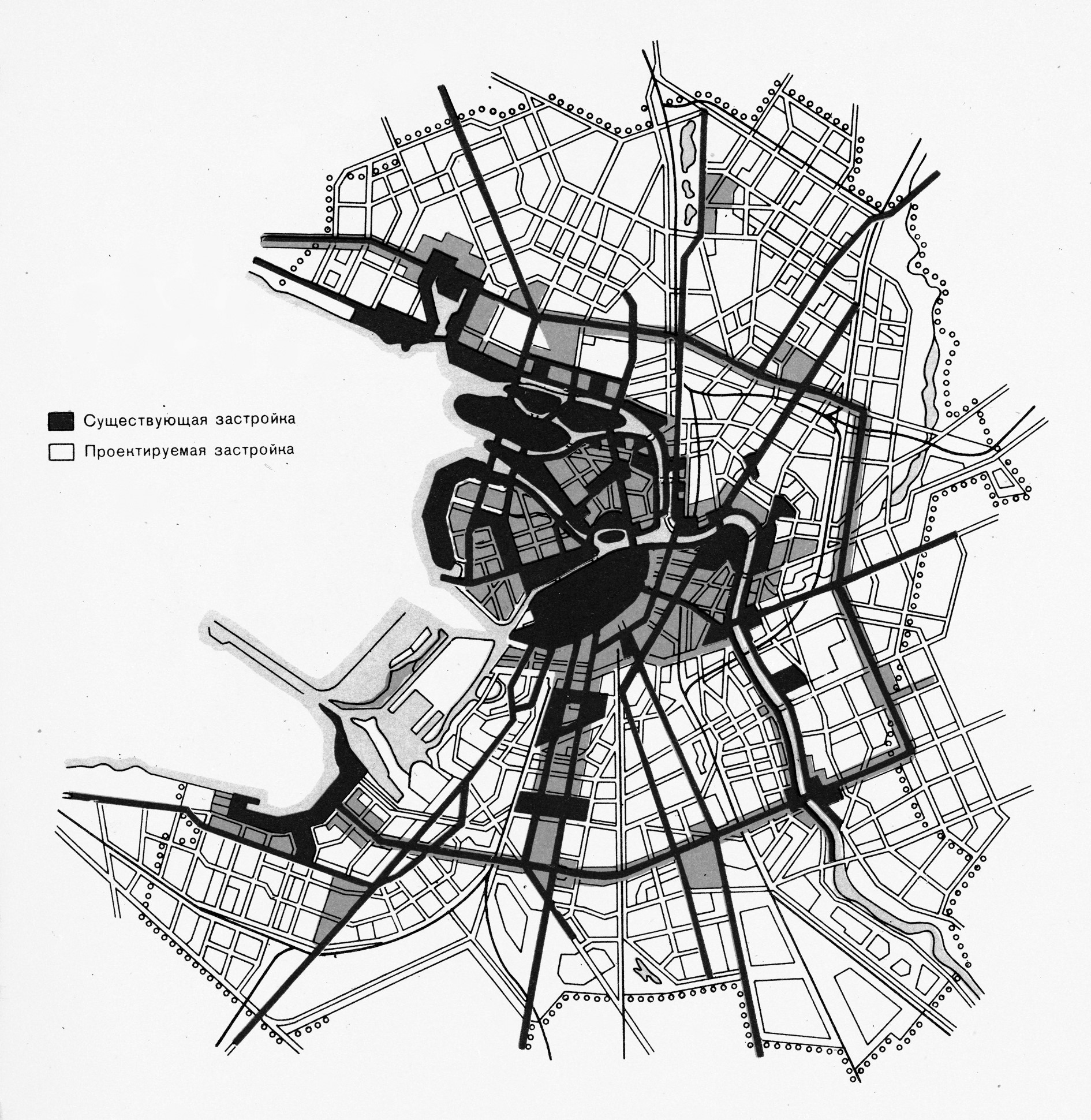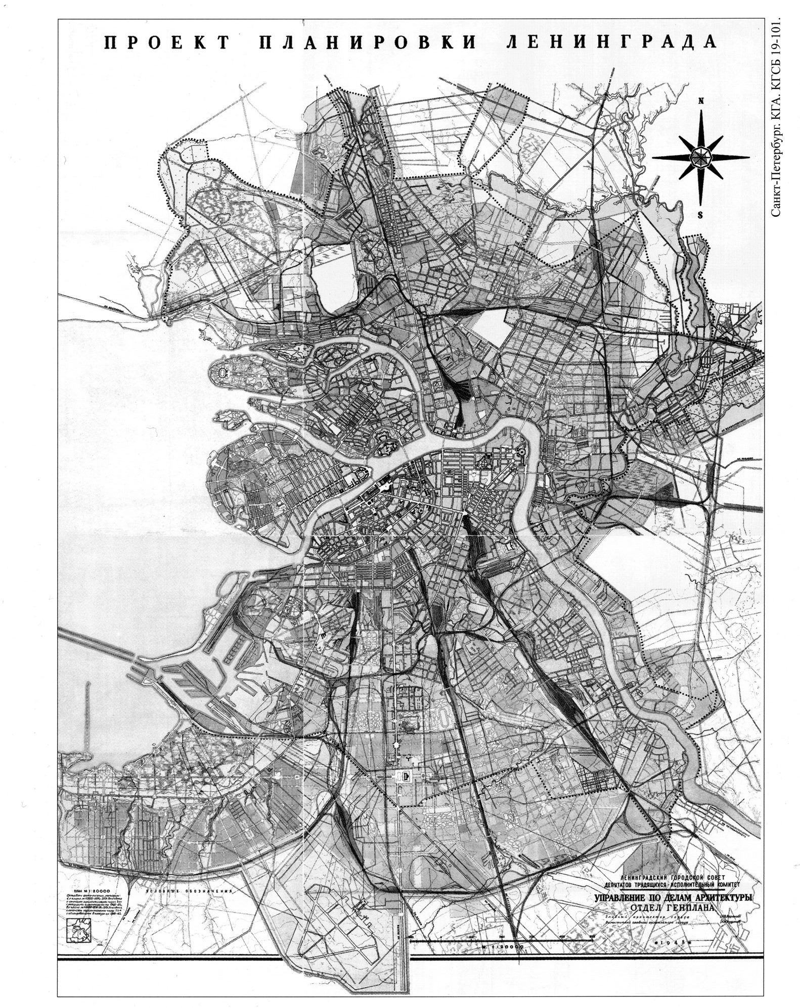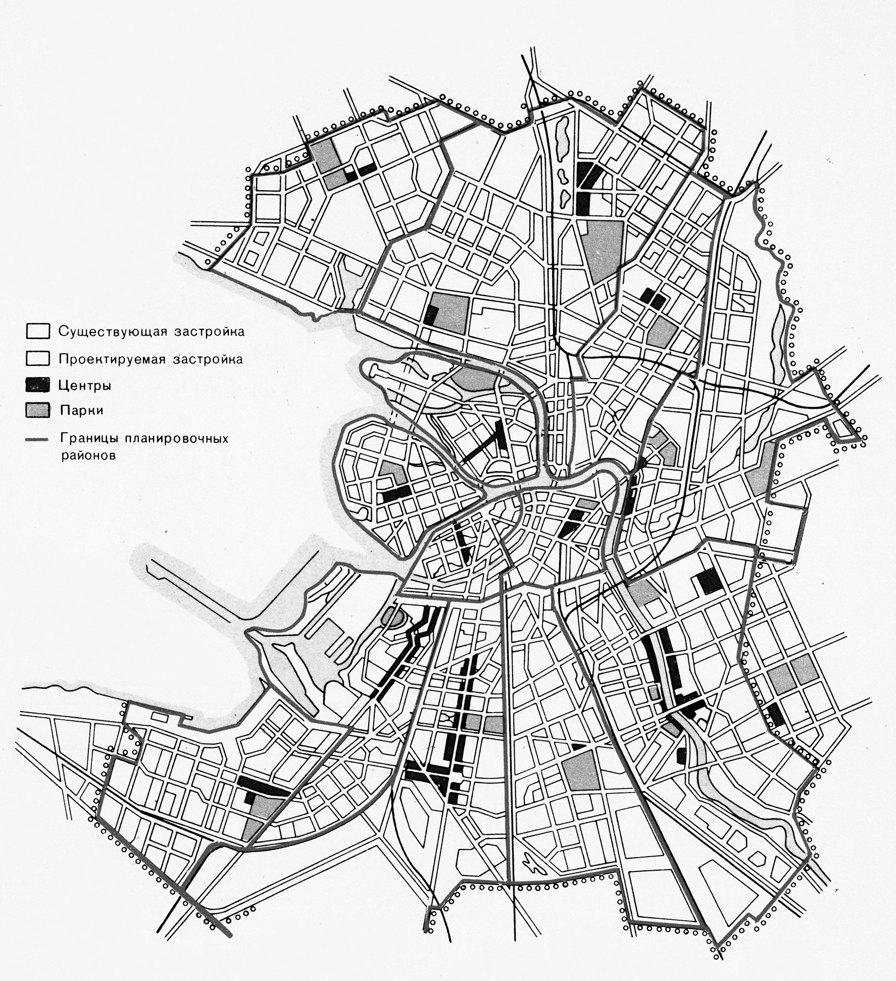 Утвержденный Советом Министров СССР в июне 1966 г. Генеральный план развития Ленинграда определил формирование города до середины 1980-х гг. (рис. 6, 7). Идея выхода города к берегам Финского залива, впервые заявленная в Генплане 1948 г., получила в новом Генплане дальнейшее развитие и реализацию. Однако многие идеи, заложенные в этом Генплане, в частности внутригородское транспортное полукольцо, позднее реализованы не были [2, с.110].