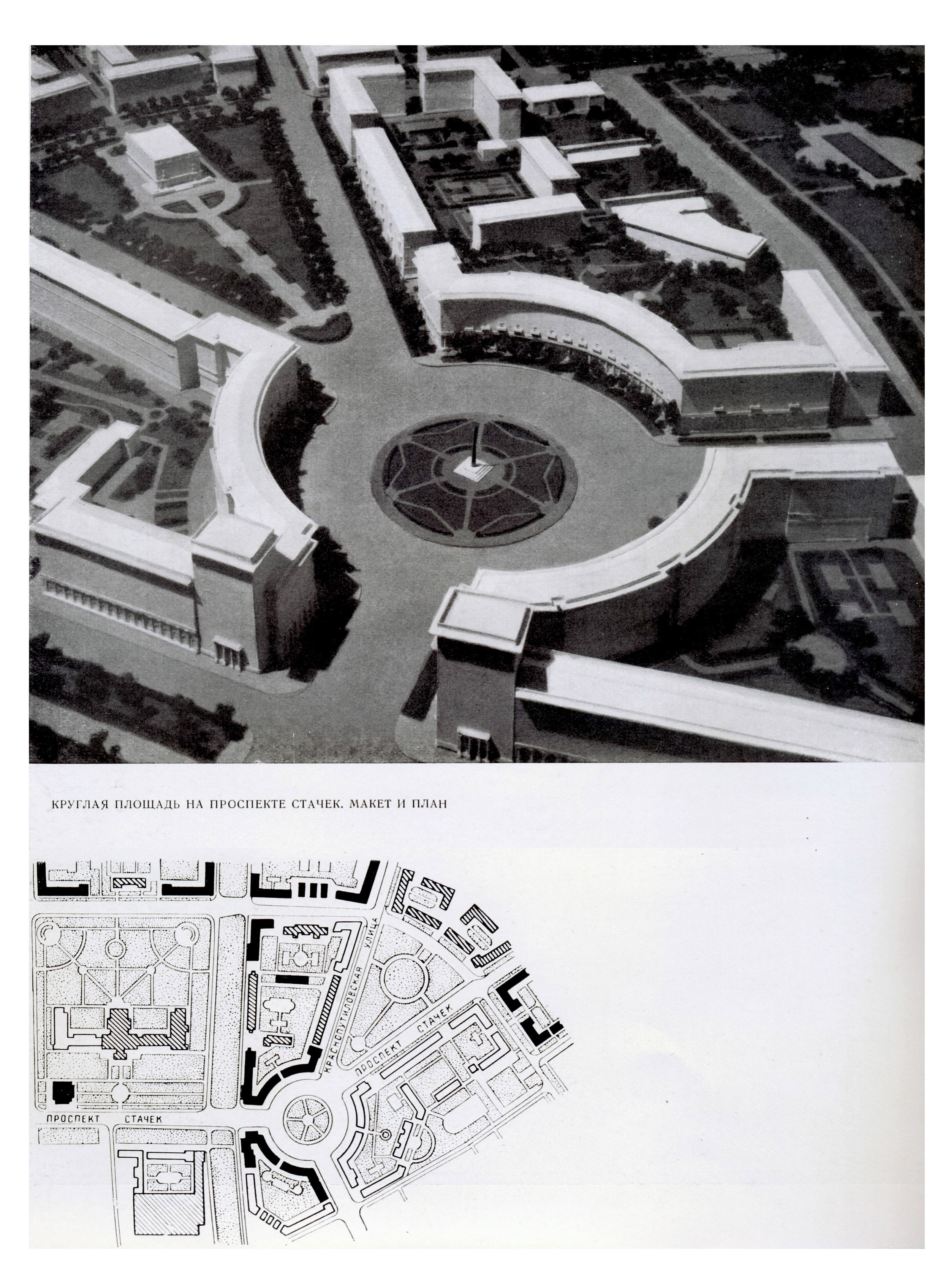 С 1944 г. началась разработка Генерального плана восстановления и развития Ленинграда. В.А. Каменский, как руководитель районной мастерской «Ленпроекта», был в числе авторов данного градорегулирующего документа, утвержденного на городском уровне в 1948 г. (рис. 2). Параллельно с этим, до 1951 г., Каменский руководил проектированием малоэтажного строительства (рис. 3) и разработкой проектов планировки, реконструкции и застройки главной магистрали Кировского района – проспекта Стачек, а также районов Автово и Дачное (рис. 4). Многие идеи застройки этой магистрали и прилегающих к ней территорий, задуманные в предвоенные годы, были реализованы в послевоенное десятилетие [2, c.109]. В.А. Каменский был автором проекта ансамбля Комсомольской площади в Кировском районе Ленинграда (рис. 5). Этот важный градостроительный узел был реализован в начале 1950-х гг.
