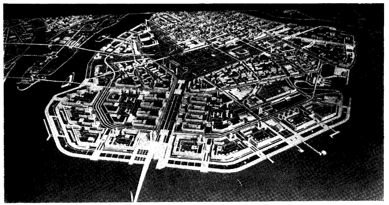 Разработанный в составе Генерального плана 1966 г. Проект планировки Пригородной зоны Ленинграда (рис. 8), включавший лесопарковый защитный пояс города, в своих основных положениях был подготовлен в конце 1950-х гг. В.А. Каменским и руководимой им группой специалистов сектора планировки Ленинградского филиала Академии строительства и архитектуры (Ленфилиал АсиА) [2, с.110]. Важной работой Каменского в конце 1960-х гг. стало руководство разработкой вариантов проекта планировки и застройки западной части Васильевского острова (рис. 9). Идеи Морского фасада Ленинграда, заложенные в этом проекте, были частично реализованы позднее, в 1980-х гг.