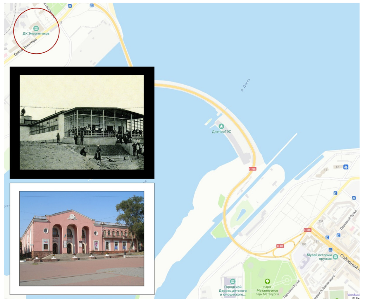 Изучаемая фабрика-кухня при Днепрогэсе не сохранилась, на ее месте в 1950-х(?) был построен ДК «Энергетиков» (рис. 4).