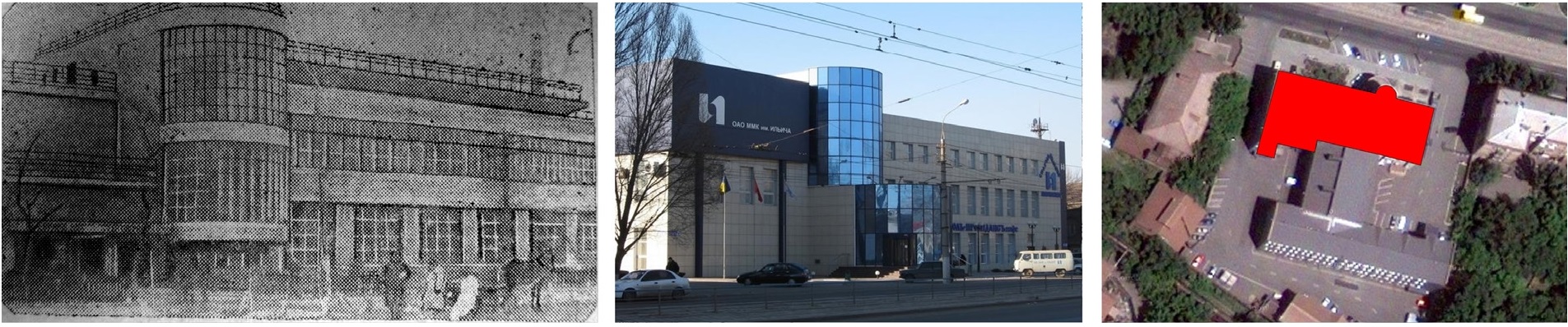 Рис. 9. Фабрика-кухня в Мариуполе, архивная фотография и современное состояние, схема генплана (публикуется впервые, источник: Российская государственная библиотека, отдел газет, www.yandex.ru/maps)