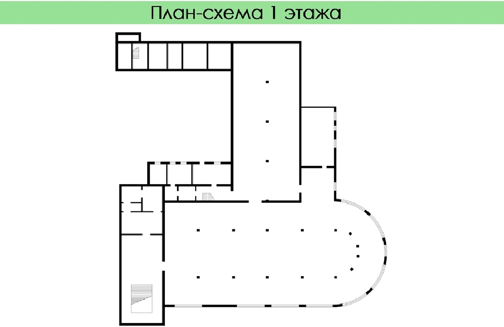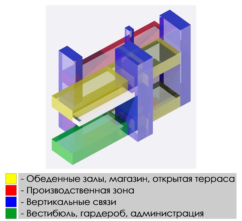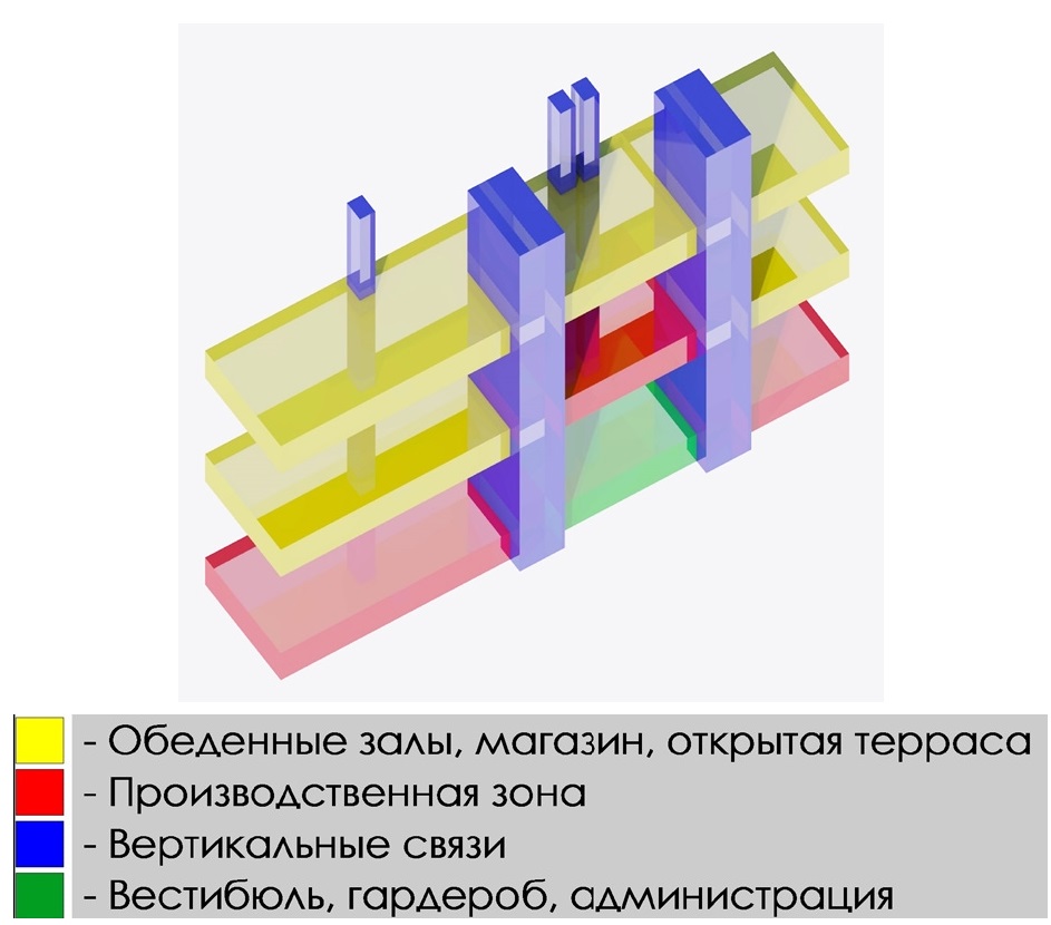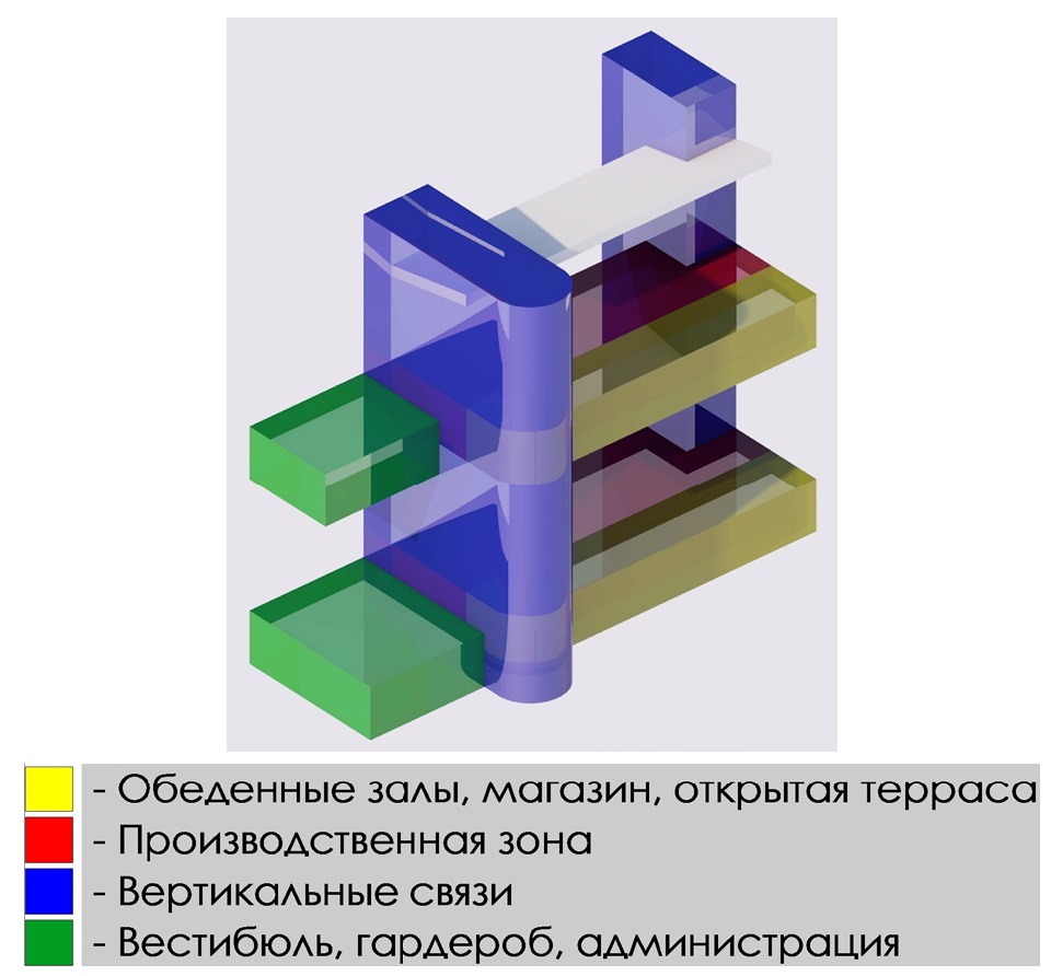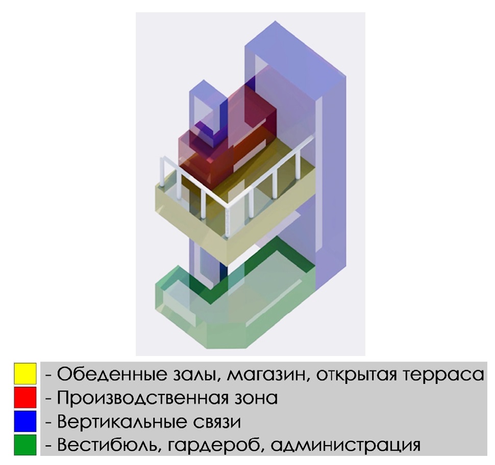 Главный вход здания обращен в сторону сквера. Сначала посетители попадали в объем вестибюльной группы с гардеробом, санузлами и умывальниками и из него далее в обеденный зал первого этажа, к которому примыкала раздача блюд и технологические помещения кухни. По главной лестнице посетители попадали в обеденный зал второго этажа и группу служебно-бытовых помещений.