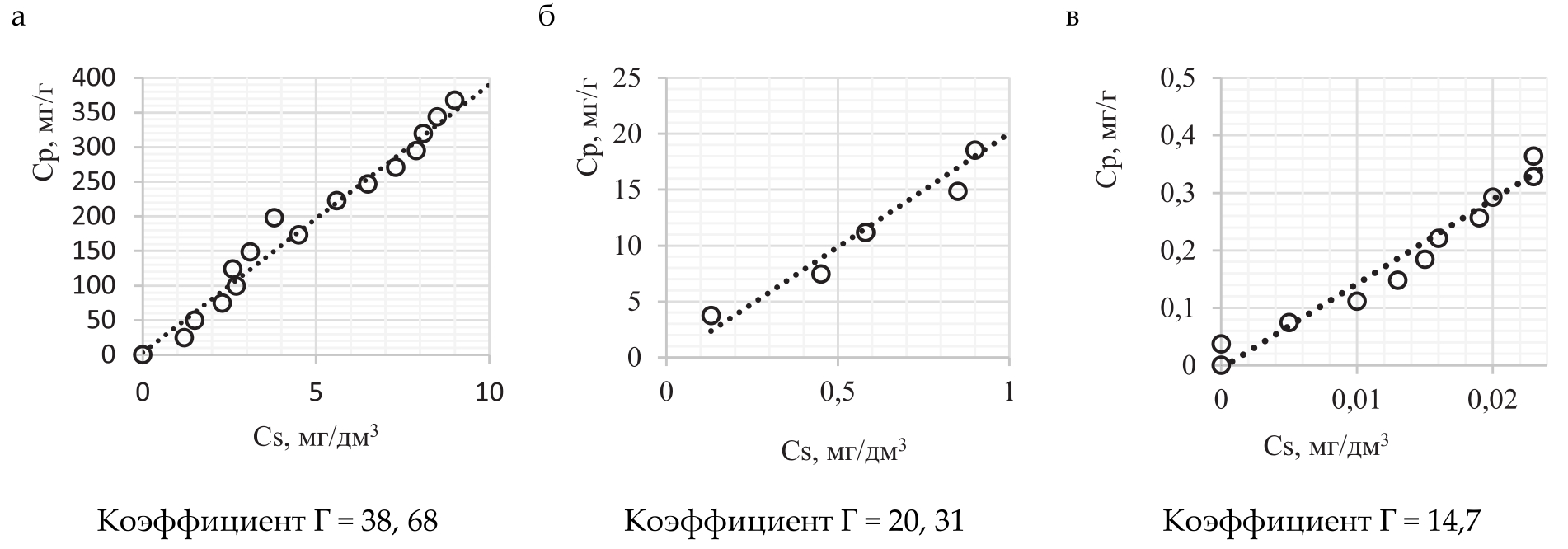 Образцы природных сорбентов тщательно промывались и высушивались до постоянного веса при температуре 20 оС. Исследование процессов сорбции проводилось для трех значений начальной концентрации нефтепродуктов (0,5, 50 и 250 мг/дм3) в модельном растворе. Вдинамических условиях при заданной скорости фильтрования (от 0,2 до 0,5 см/с) определялась остаточная концентрация вещества (мг/дм3) и рассчитывалась сорбционная емкость (мг/г). Далее анализировалась интенсивность процесса извлечения нефтепродуктов, характеризуемая коэффициентом Генри (Г) в зависимости Ср=Г∙Сs (Ср – сорбционная емкость, мг/г, Сs– остаточная концентрация загрязнения, мг/дм3) для прямолинейного интервала изотермы сорбции.