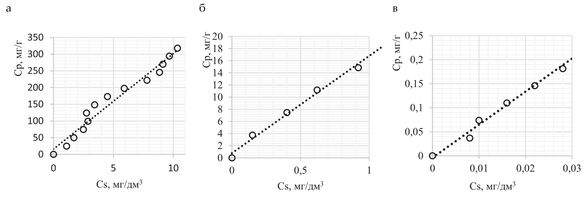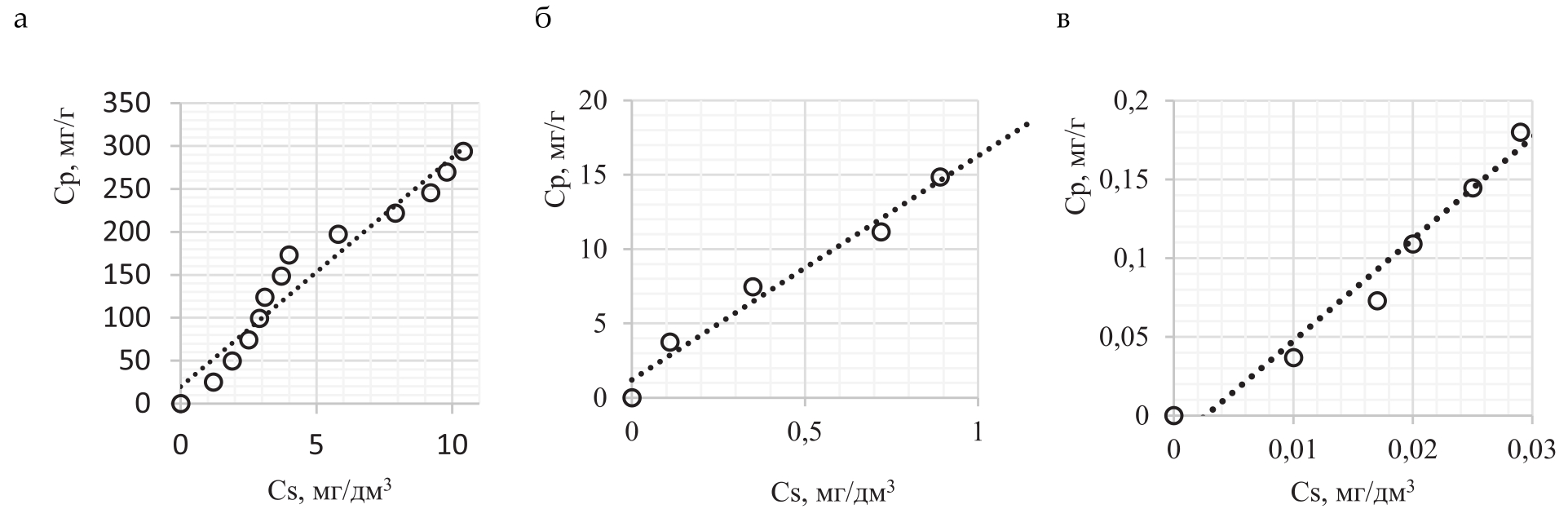Рис. 1. Изотермы сорбции нефтепродуктов торфом из водных растворов при исходной концентрации, мг/дм3: а – С0=250; б – С0=50; в – С0= 0,5