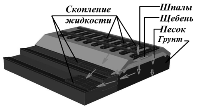 Рис. 2. Движение поверхностной воды в теле верхнего и нижнего строения пути
