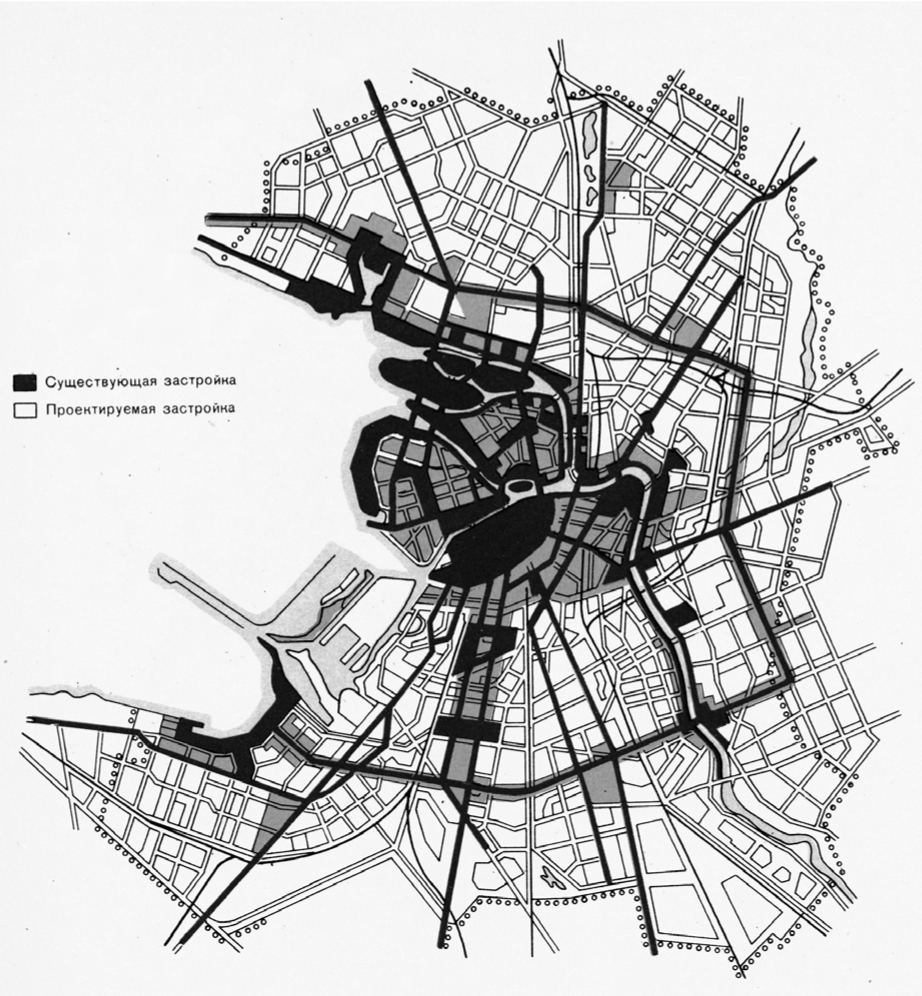 В начале 1966 г. работа над новым Генеральным планом развития Ленинграда (авторы В. А. Каменский, А.И. Наумов, Г. Н. Булдаков, К. С. Кривцов, М.И. Василевский, В. Ф. Назаров, Г.К. Григорьева и др.) была завершена, 15 июля того же года он был утвержден специальным правительственным Постановлением и до середины 1980-х гг. стал законом для развития города (рис. 13).