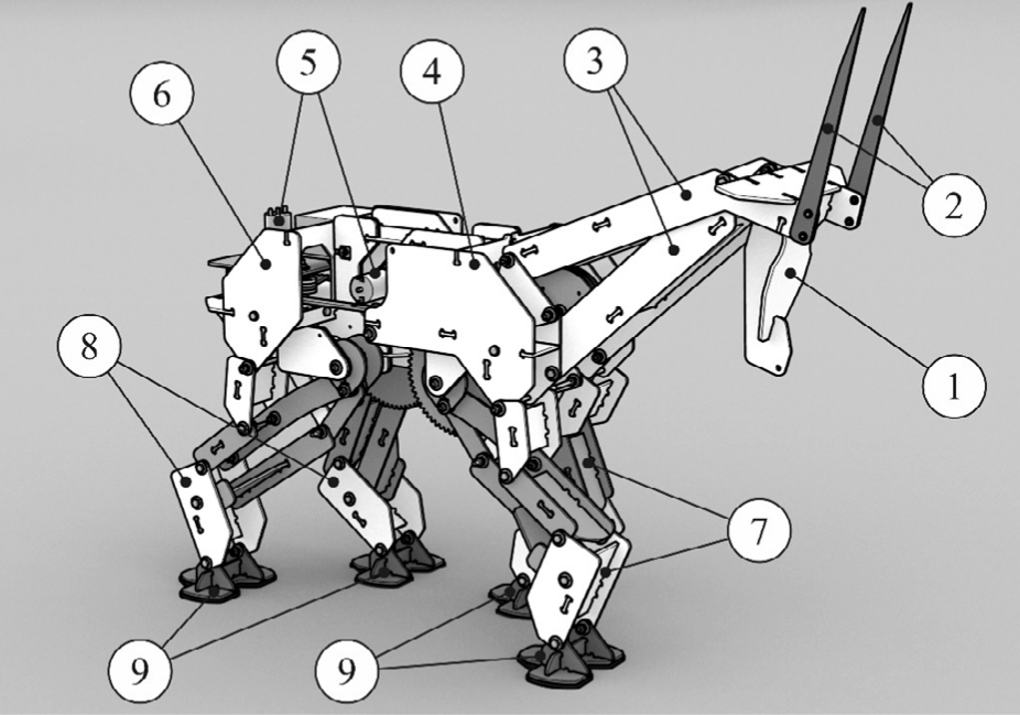 Рис. 2. Общий вид шагающей модели: 1 – голова; 2 – съёмные рога; 3 – подвижные элементы шеи; 4 – передняя часть корпуса; 5 – задние ноги; 6 – задняя часть корпуса; 7 – передние ноги; 8 –задние ноги; 9 – опорные части ног в форме копыта