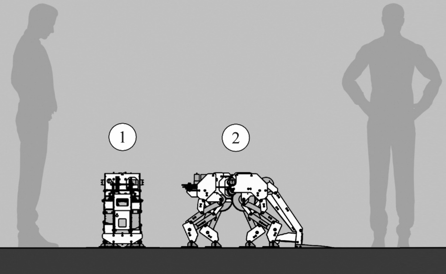 Рис. 6. Габаритные размеры шагающей модели «Альба Капра»: 1 – вид спереди с опущенной головой; 2 – вид сбоку с опущенной головой
