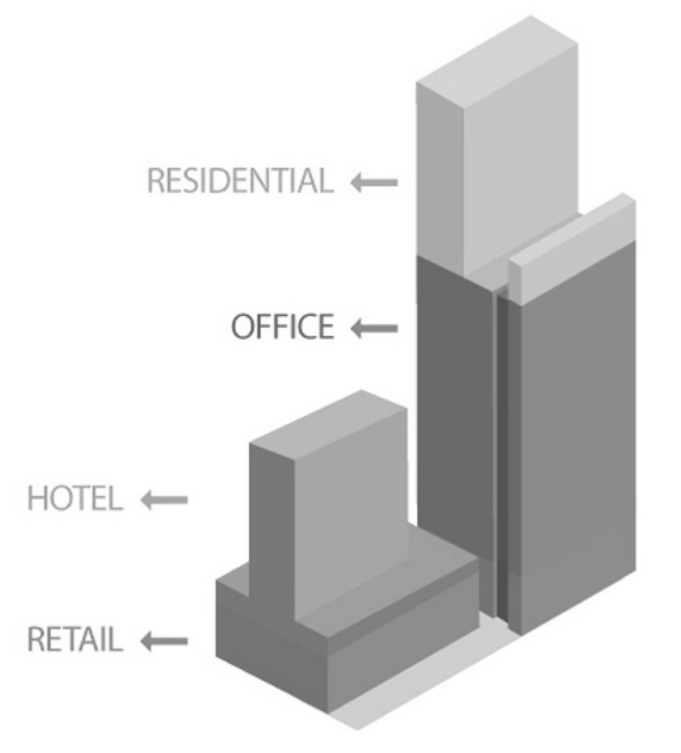 Планировщики городской среды давно поняли, что объединение в одном здании или комплексе базового набора необходимых объектов, например пунктов питания, магазинов и офисов, позволяет решить множество проблем, таких как: растущую нагрузку на транспортную инфраструктуру, хаотичность человеко-потоков и других негативных последствий плотной планировочной структуры. В Сингапуре осмысление важности процессов вертикального зонирования началось несколько десятков лет назад и разрабатывается до сих пор, иногда воплощаясь в уникальных архитектурных решениях. Примером могут служить деловые центры, совмещенные с жилыми блоками со скверами на кровлях, предприятиями питания и торговыми комплексами [1] (рис. 1).