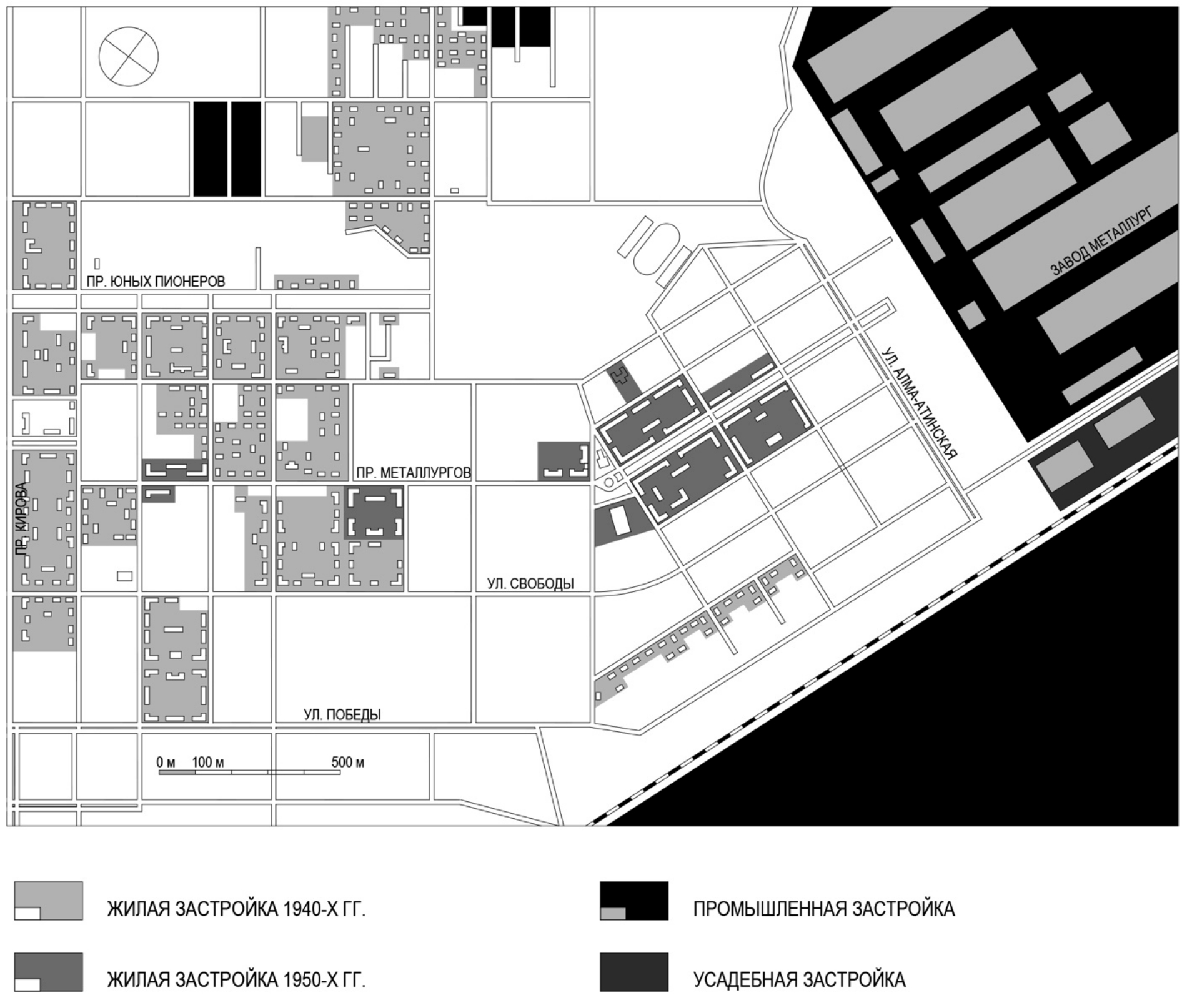 Планировочная структура жилого поселка ориентирована главной композиционной осью – проспектом Металлургов – на предзаводскую площадь Куйбышевского металлургического завода (КМЗ), которая разделяла промышленную территорию и жилую застройку. От треугольной площади (в настоящее время площадь им. П.П. Мочалова) с общественным центром района – кинотеатром «Октябрь» и Домом культуры «Металлург» – проспект Металлургов превращается в зеленый бульвар с зелеными курдонерами в квартальной застройке и общественными объектами в первых этажах жилых зданий. Общественный центр ориентирован на районный парк «50-летия Октября». Вторую композиционную ось района образует бульвар Юных Пионеров, соединивший Молодежный парк, парк «50-летия Октября» и стадион «Металлург» в единую систему. Планировочную структуру рабочего поселка формирует прямоугольная сетка улиц, которая меняет свое направление по улицам Елизарова и Марии Авейде. Большая часть жилых кварталов застроена типовыми 2-этажными зданиями 1940-х гг., центральный проспект Металлургов оформлен 5-этажной застройкой 1950-х гг. (рис. 3).