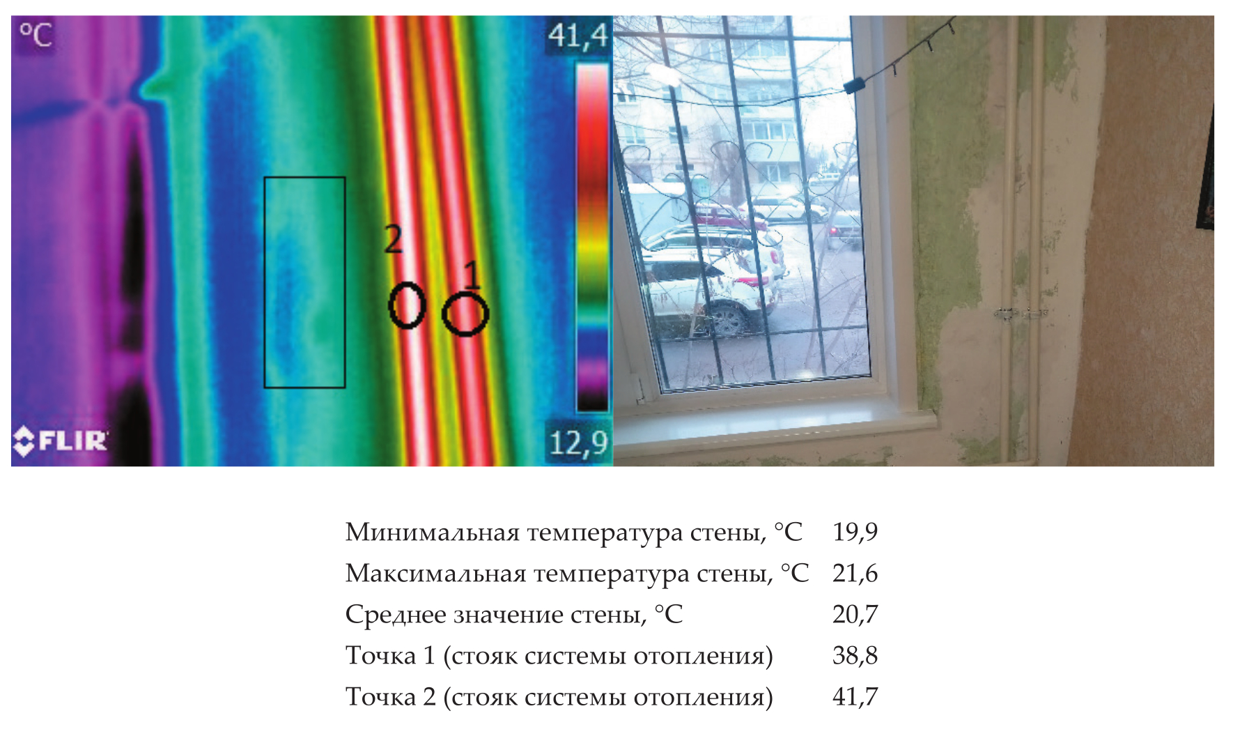 Площадь наружных стен жилого дома составляет 1410 м2 (за минусом окон и балконных дверей). Тепловые потери через наружные стены по результатам расчета сопротивления теплопередаче составляют 66740 Вт; на основании значений сопротивления теплопередаче, полученных экспериментальным путем, составляют 88500 Вт. Разница полученных значений составляет 21760 Вт, что в процентном соотношении составляет примерно 25%. Как показали результаты исследований, опубликованные в работах [3–5], утепление наружных стен существенно снижает тепловые потери в помещениях (ГОСТ Р 54852–2011 «Метод тепловизионного контроля качества теплоизоляции ограждающих конструкций»). Рекомендовано выполнить утепление наружных стен.