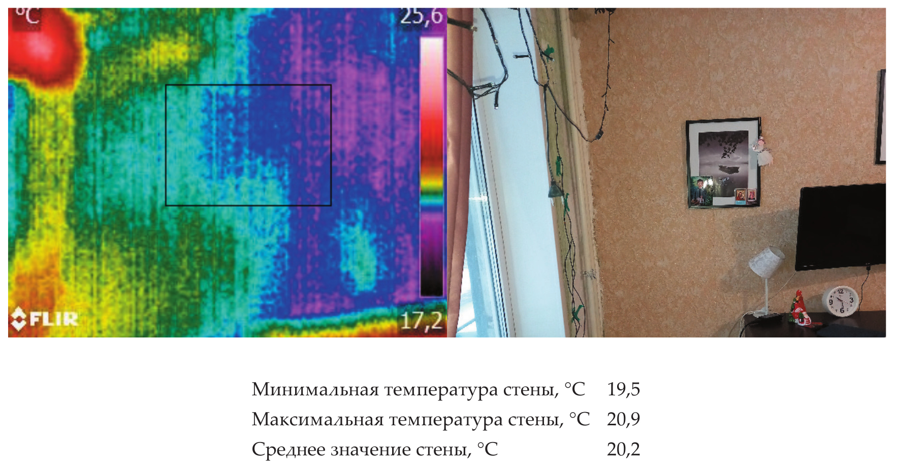 Из полученных результатов видно, что температуры на внутренней поверхности стены, полученные с помощью тепловизионной съемки, отличаются от значений, полученных с помощью измерителя теплового потока ИТП–МГ4.03/5(1), на величину погрешности измерения и практически совпадают, что свидетельствует о точности полученных результатов.