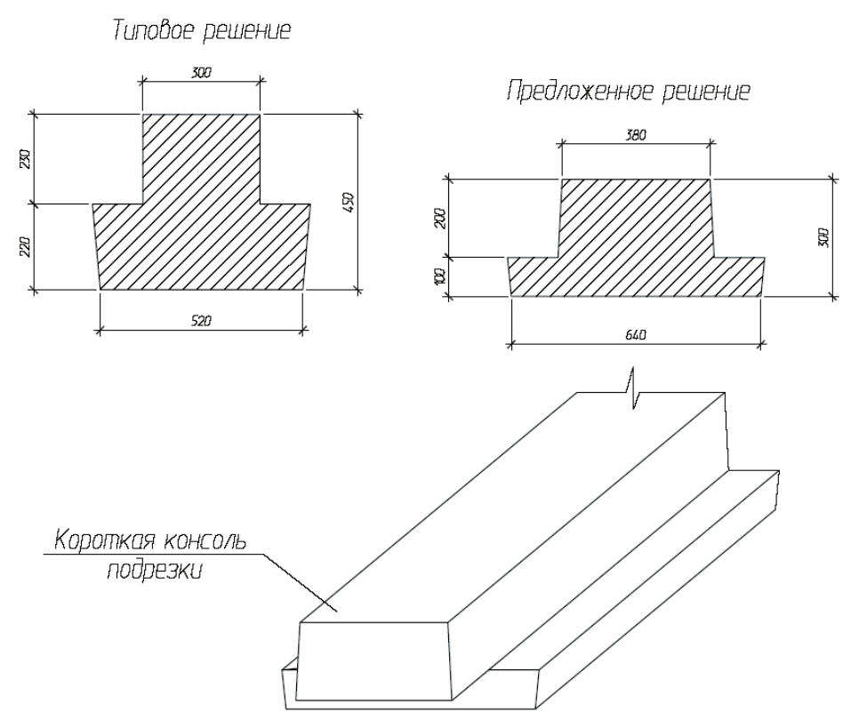The frame includes prestressed cross-sectional T-bars (with a flange in the tension zone) with undercuts in the support zones. This crossbar design, combined with precast hollow-core floor slabs, allows the creation of a ceiling surface without protruding ribs. In contrast to a similar crossbar of the standard series 1.020–1.87, the developed cross-section has a lower height of 300 mm (in the standard version, the cross-section height is 450 mm). A formwork drawing of the crossbar is presented in Fig. 1. Calculations for strength, stiffness, and crack resistance, as well as the crossbar design, were performed by employees of the Department of RCS of the Academy of Construction and Architecture, Samara State Technical University, using methods partially described in [1, 2].