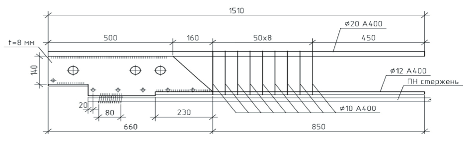 To ensure the strength of inclined sections under the transverse force and bending moment, frames using rigid inserts made of sheet steel were used as transverse reinforcement (Fig. 2). Such reinforcement provides significant load-bearing capacity for the short cantilever formed by undercutting, with relatively small cross-sectional dimensions of the cantilever.