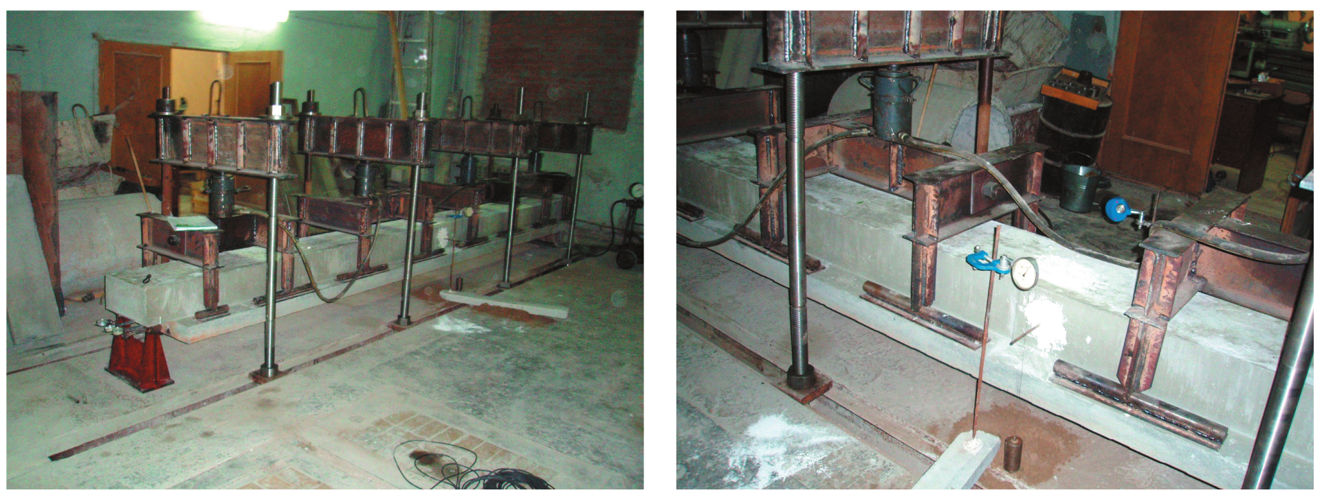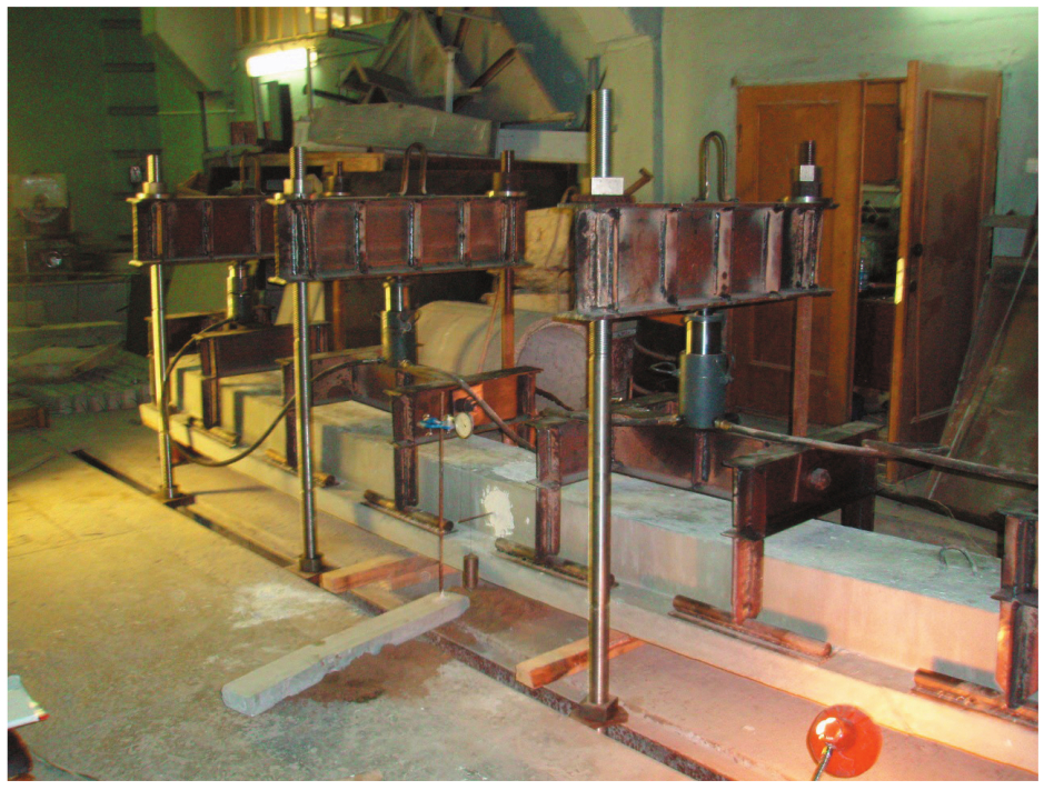 The test was performed using four DG-25 hydraulic jacks. The pressure in the jacks was created through a manual hydraulic pump station. A general view of the tested structures is shown in Fig. 4.