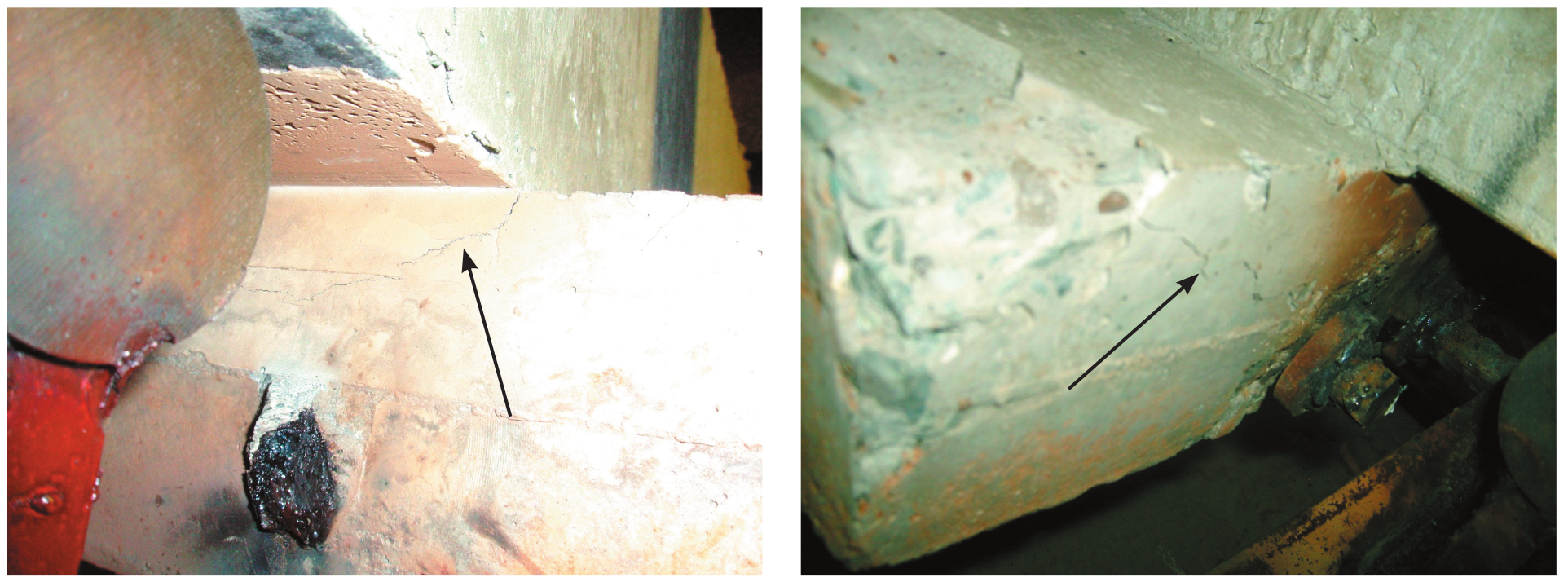 At stage 8 of loading at a load of 35 tons (6.481 t/m), arc-shaped cracks were recorded at the ends of the crossbar flanges. These cracks at loading stage 11 are presented in Fig. 5.
