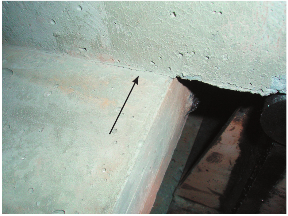 Cracks along the span at the junction of the flanges (Fig. 6) showed significant development dynamics at stage 9 of loading at a load of 41.5 t (7.685 t/m). The opening width of these cracks was 0.7 mm. However, their lengths changed slightly. With further loading, the opening width of these cracks changed insignificantly.
