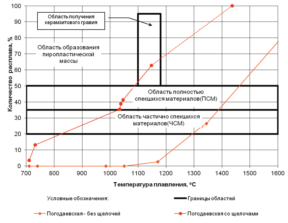 в) Динамика образования расплава в глине Погодаевского месторождения без корректирующих добавок аналогична глине Таскалинского месторождения с небольшим смещением в низкотемпературную зону. При введении в глину Погодаевского месторождения 2 % щелочей количество эвтектического расплава становится более 50 % и может привести к образованию пиропластической массы, способной вспучиваться. В данном случае глину с такой добавкой можно рекомендовать для производства керамзитового гравия.