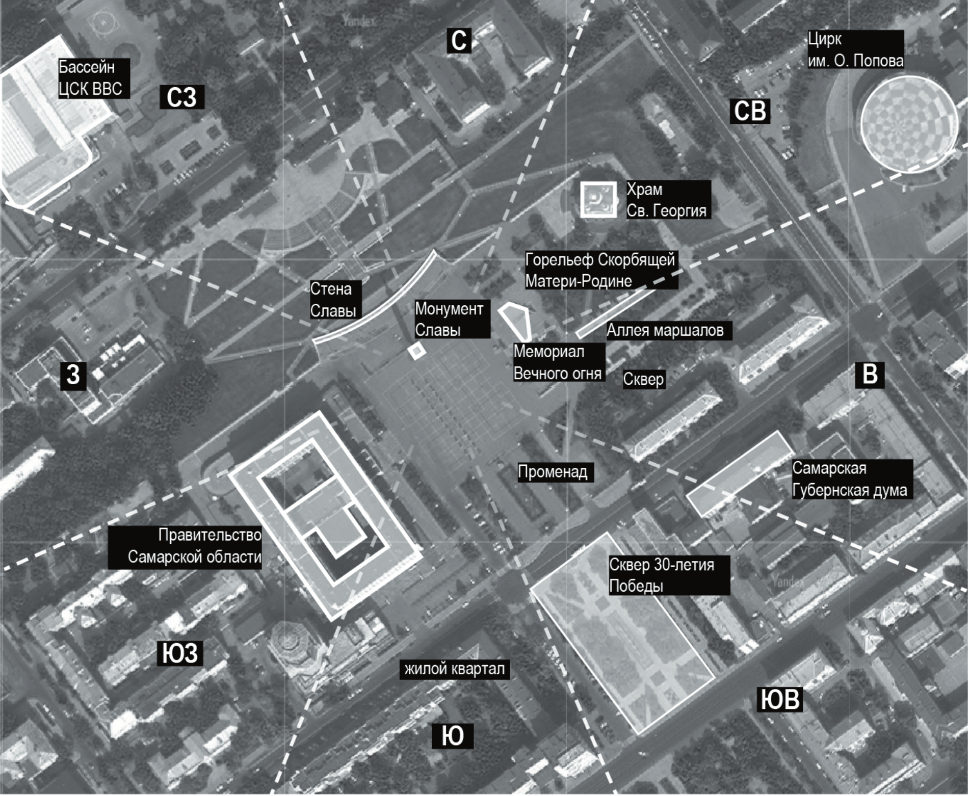 Формирование секторальной модели освоения пространства проводилось на уровнях анализа от геополитики до частного подворья. Городские объекты были представлены историческими центрами (Санкт-Петербург), площадями и парками (Самара) [11] и секторальной моделью территориально-административного деления крупнейшего города (Минск, Москва) [12−14]. Особенность Самары в том, что её улицы ориентированы в силу особенностей расположения между реками Волгой и Самарой, главным образом по промежуточным сторонам света. Площадь Славы г. Самары становилась предметом анализа в 2015 г. [11], Комсомольская площадь – в 2018 г. [15]. Во всех этих исследованиях анализируемый пространственный объект выборочно представлял данный класс объектов городской застройки, однако их сравнительного анализа в рамках функционального зонирования ещё не производилось. Возможность нахождения в каждой точке пространства множества самых разнообразных объектов осложняет на данном этапе применение стохастического анализа. Поэтому в настоящем исследовании предпочтение отдаётся анализу сравнительному, позволяющему акцентировать внимание на объектах, особо значимых для конкретного архитектурного ансамбля.
