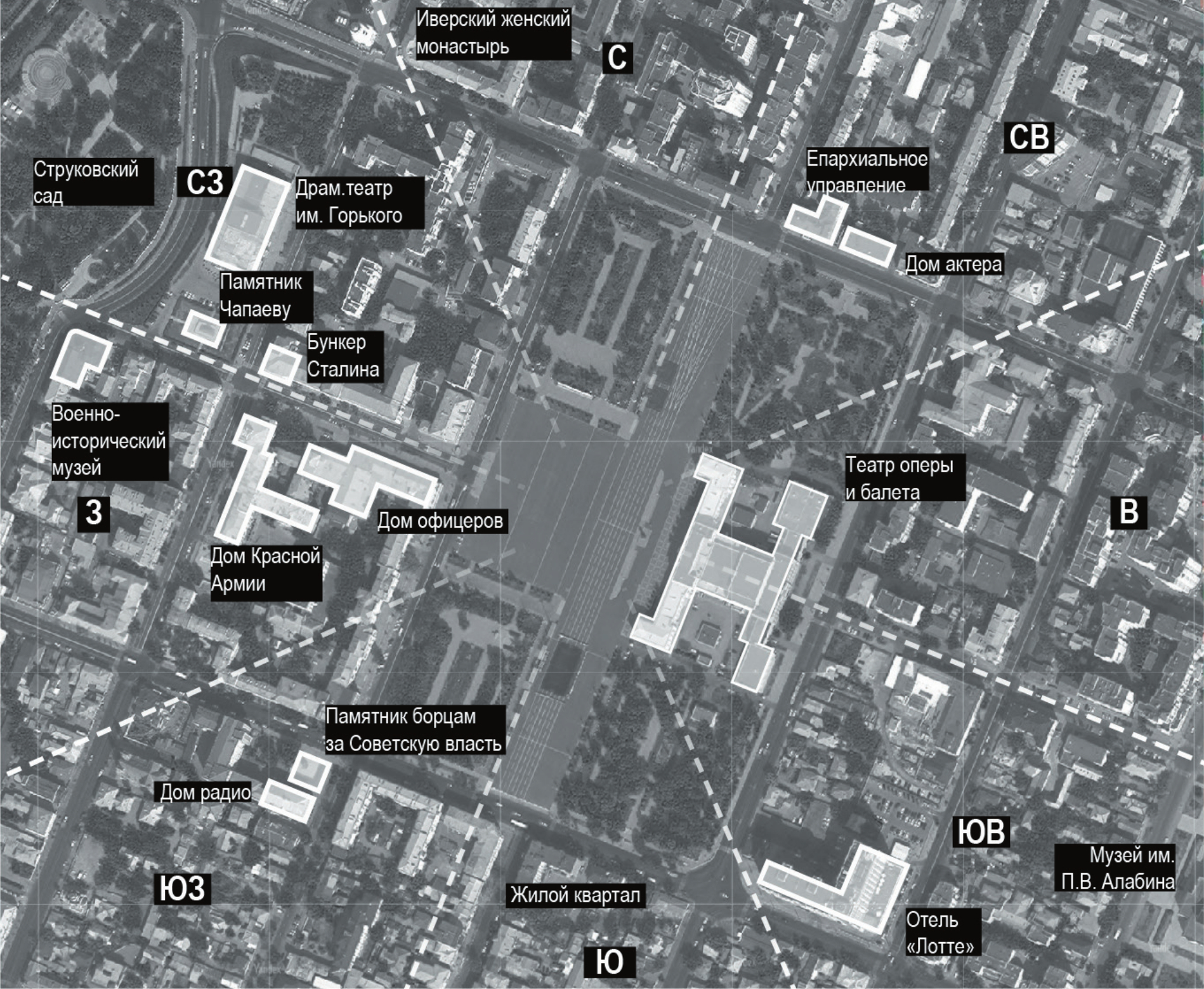 Цель исследования – анализ реализации градостроительных функций и их символических значений в каждом из восьми секторов пространства территории площадей.