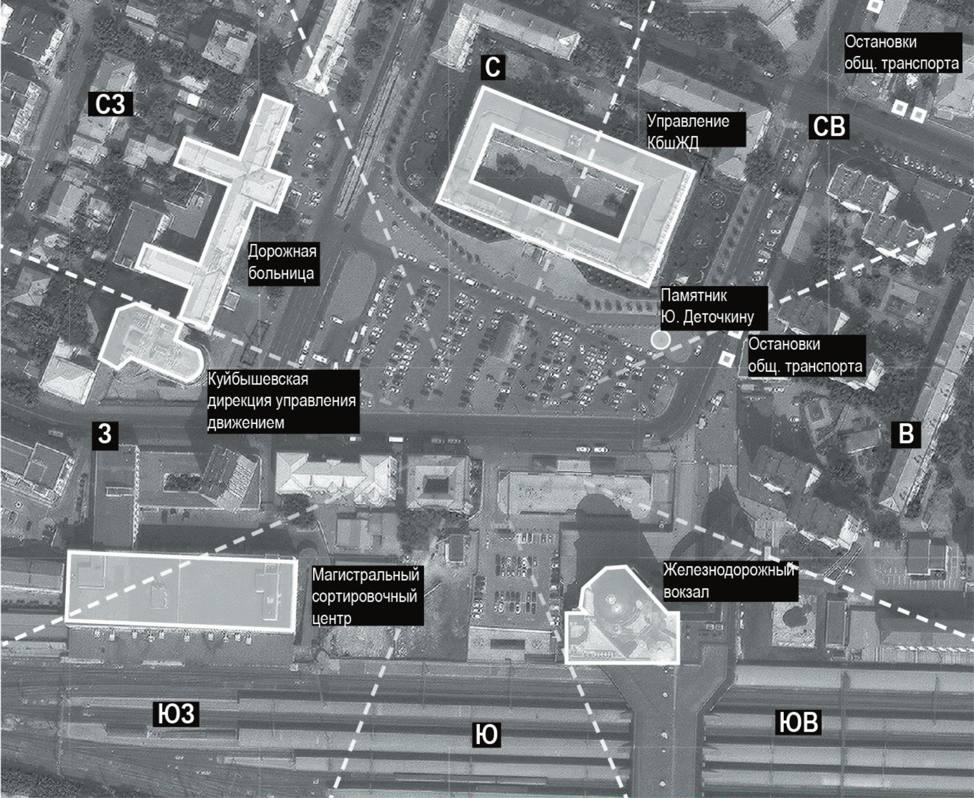 Комсомольская площадь Самары известна как привокзальная. Изначально данная площадь простиралась до Губернского рынка на её северной оконечности, т. е. площадь была в 4–5 раз больше. Сегодня объём Комсомольской площади с севера ограничен зданием Управления Куйбышевской железной дороги – филиал ОАО РЖД (северо-восточный сектор). Комсомольская площадь развивалась интенсивно, в том числе за последние 20 лет. С установкой в 2012 г. памятника Юрию Деточкину (скульптор И. Мельников), символизирующего пассажира, была реализована и субъектная функция. Левая рука Деточкина, держащая шляпу, откинута в приветственном жесте, у ног стоит саквояж, а правая – вытянута в направлении северо-востока.