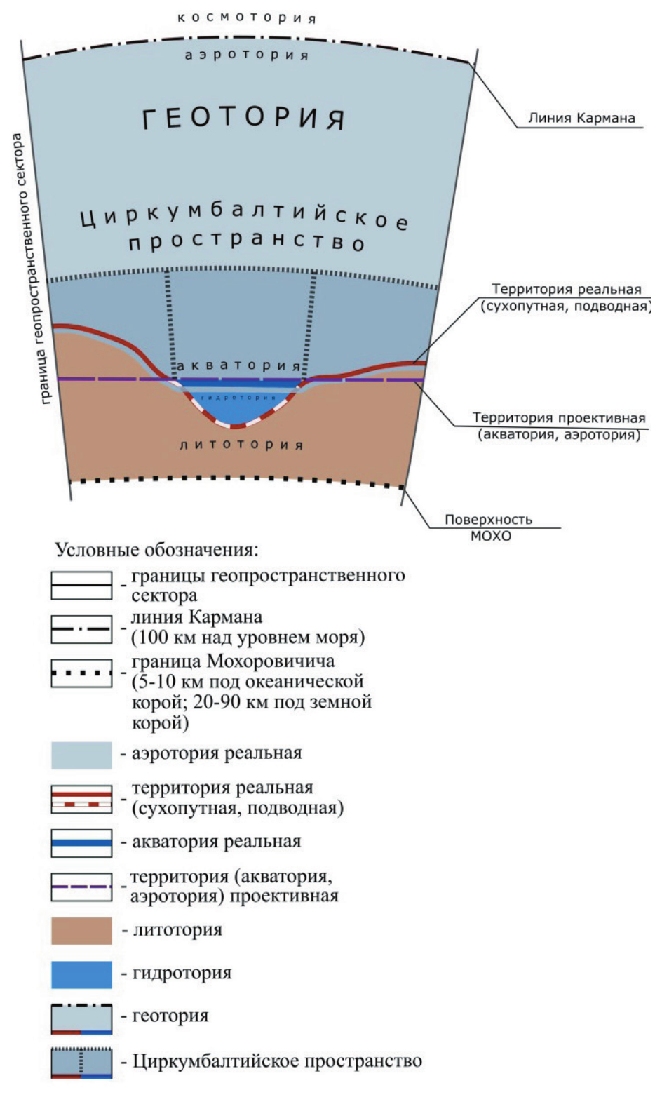 Эта задача решается нами на основе: 1) геопространственного подхода, базирующегося на принципе конструктивного реализма и опирающегося на методологию конструктивного моделирования [7], 2) геоисторической парадигмы, 3) концепта геотории (рис. 1), 4) теоретико-методологических основ делимитации специфической геопространственной формы, сформированных ранее [5], – посредством последовательного рассмотрения территориального, акваториально-территориального и аэроториального аспектов пространствообразования с учетом нормативно-правовых ограничений и правил, действующих сегодня в сферах регионального территориально-пространственного планирования, морского пространственного планирования, нормативно-технического и правового регулирования использования воздушного пространства, с дальнейшим формированием цифровой модели объекта – «слепка» концептуального или когнитивного пространства Циркумбалтики [5].