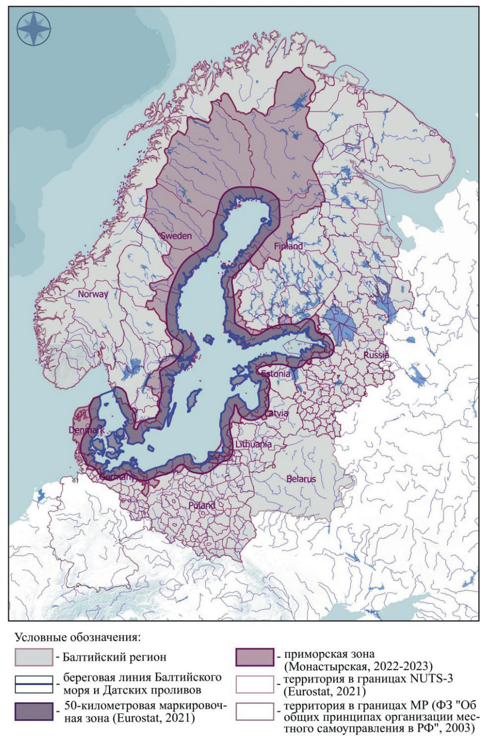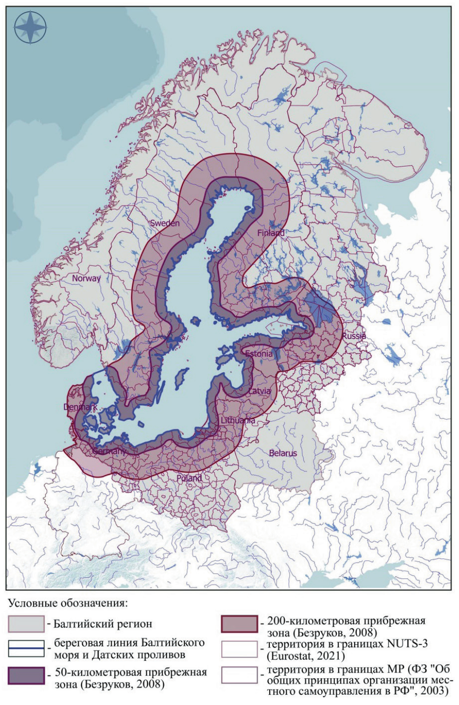 Таким образом, по Децу, главным индикатором принадлежности территорий к приакваториальным объектам, согласно методике Евростата, становится их население [22, с. 19] и административный статус. Номенклатурно-географические образования третьего уровня «в каждой стране ЕС (названия и даже сами средние площади таких <…> образований отличаются друг от друга) были включены в ряд» [22, с. 19] «прибрежных регионов» «при соблюдении следующего условия: более половины населения территории должны проживать не далее 50 км от побережья» [там же]. К категории «прибрежных регионов» были формально причислены «крупные по площади административно-территориальные образования севера Финляндии и Швеции, <…> континентальные части которых располагаются более чем в 250 км от морских побережий, но население которых преимущественно проживает в приморской зоне» [22, с. 19]. К таким NUTS 3 относятся малонаселенные шведские лёны Вестерботтен с административным центром Умео (площадь 54 672 км2, плотность населения 4,7 чел./км2) и Норрботтен с административным центром Лулео (площадь 97 257 км2, плотность населения 2,5 чел./км2), а также финские провинции Лапландия с административным центром Рованиеми (площадь 92 660 км2, плотность населения 2,0 чел./км2) и Северная Остроботния с адмистративным центром Оулу (площадь 35 508 км2, плотность населения 11,5 чел./км2). С другой стороны, значительно уступающие перечисленным «прибрежным регионам» по площади, но намного более плотно заселенные NUTS 3 Германии (земельные районы), Литвы (уезды), Латвии (статистические районы), Польши (подрегионы), Эстонии (мааконды), МР Калининградской и Ленинградской областей, а также город федерального значения Санкт-Петербург практически полностью входят в границы маркировочной 50-километровой полосы, что прямо указывает на избыточную формализацию территориально-делимитационной методики Евростата в отношении определения границ «зон притяжения» моря (рис. 3). Порядок же выявления «прибрежных зон», принятый Евростатом и базирующийся на концепте «территориализации» [9, 17] может, тем не менее, представлять значительный интерес, в том числе при решении вопросов территориально-акваториального толка в процессе «конструирования» «контактной структуры» [14] «суша-море».
