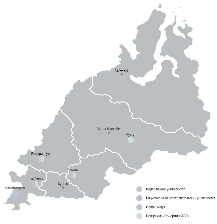 В последнее время в России развитию кампусов вузов стало уделяться особое внимание. Это подтверждается реализацией национальных проектов «Образование» и «Наука», развитием сети федеральных и национальных исследовательских университетов, выделением опорных вузов в т.ч. на территории Уральского федерального округа (УрФО) (рис. 1). В числе основных тезисов проектов развития можно отметить необходимость формирования в регионах современных образовательных центров на основе развития существующих учебных заведений, укрепления связей вузов с экономикой и социальной сферой, совершенствования требований к подготовке высококвалифицированных специалистов.