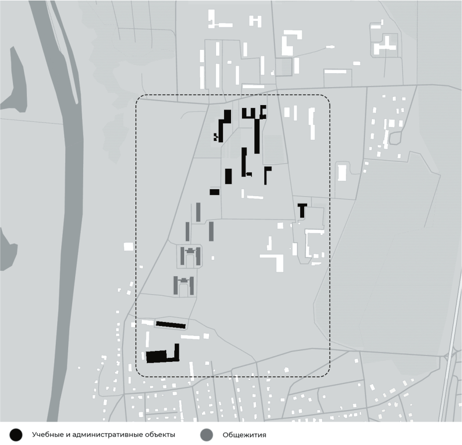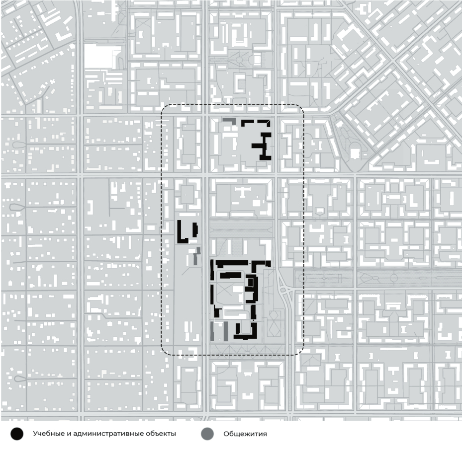 Кампус вуза понимается как комплекс объектов, связанных доминирующей научно-образовательной функцией. Комплекс включает учебные, научно-исследовательские, административные и жилые здания, а также объекты спорта, инфраструктуры обслуживания и рекреационные пространства. Кампус высшего учебного заведения – многофункциональный комплекс зданий, предназначенный для размещения подразделений вуза, связанных системой особых общественных пространств, формирующих единую среду для высшего образования, научных исследований, а также широкого спектра сопутствующих функций в системе «труд-быт-отдых» всех уровней для участников данных процессов [1].