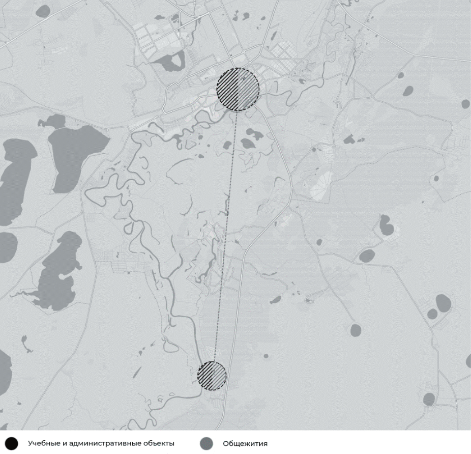 Рис. 5. Расчлененный (двухчастный) кампус Курганского государственного университета (КГУ), г. Курган