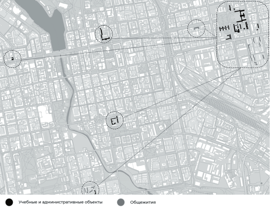 В реальной практике представлены различные сочетания типов архитектурно-градостроительного размещения кампусов. Например, кампус Уральского федерального университета (УрФУ) имени первого президента России Б. Н. Ельцина, г. Екатеринбург – сочетает элементы компактного и рассредоточенного типов (рис. 8).