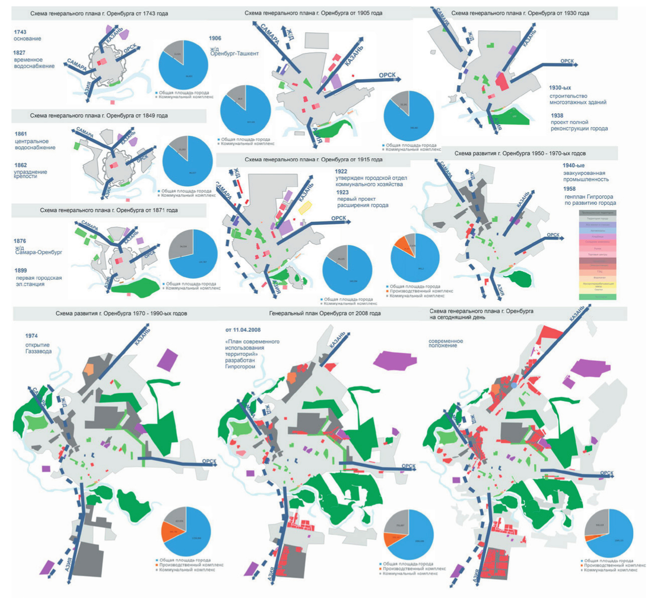 Для исторического сравнения была проанализирована территория коммунального комплекса от основания города Оренбурга до настоящего времени (табл. 1). При основании города в 1743 г. баланс территорий коммунального комплекса относительно общей площади города составил 18 %. На следующем генплане от 1849 г. данное соотношение составляет 16 %. Это, по всей видимости, связано с увеличением плотности застройки в периметре крепостных стен. Возможно, активное строительство спровоцировала отмена воинского постоя в 1821 г. Площадь города увеличилась, а площади коммунального комплекса – нет, но качество очевидно выросло. В 1827 г. в городе существовала временная водозаборная система, а в 1861 г. – централизованный водопровод (отмечены только на генплане от 1871 г.). Также значительно больше стала площадь озеленения, это объясняется появлением за пределами крепости благоустроенных дач. На схеме генплана от 1871 г. заметно увеличение общей площади города, что связано с упразднением крепости в 1862 г. Баланс площади города к площади коммунального комплекса составлял 40 %. Это наследие «золотого века» военного губернатора В.А. Перовского, который активно занимался повышением качества городской среды. Процент озеленения снова вырос – Зауральная роща стала парковой зоной. Кроме того, в деятельной среде коммунального комплекса появилась новая категория – инженерные предприятия.