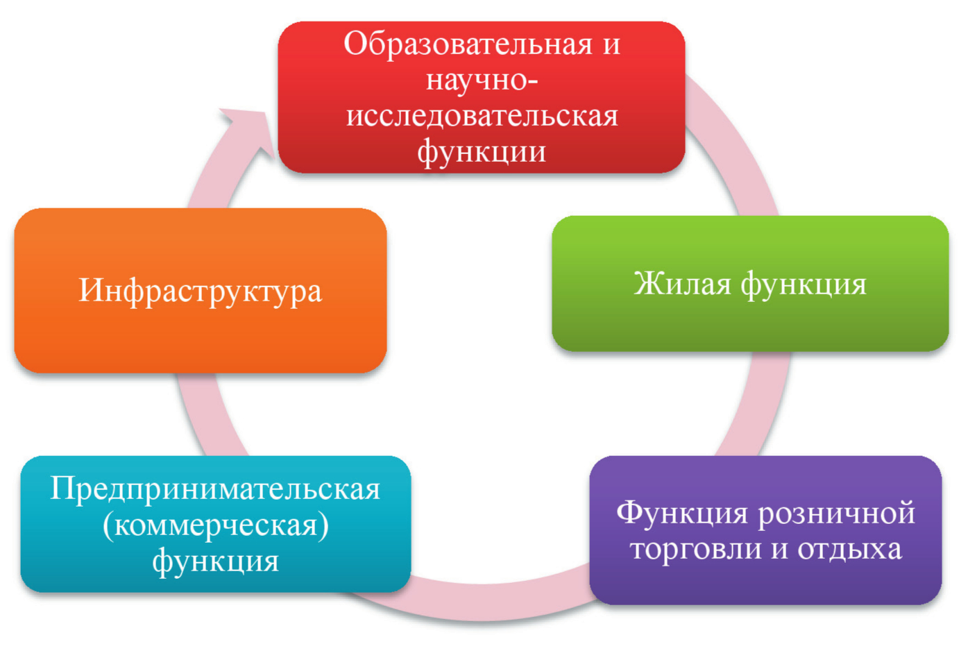 The zones under consideration can be grouped by considering the mandatory aspects of university processes. Consequently, we obtained integrated functions of campus areas, including educational and research functions, housing, retail and recreation, entrepreneurship, and infrastructure (Fig. 1).