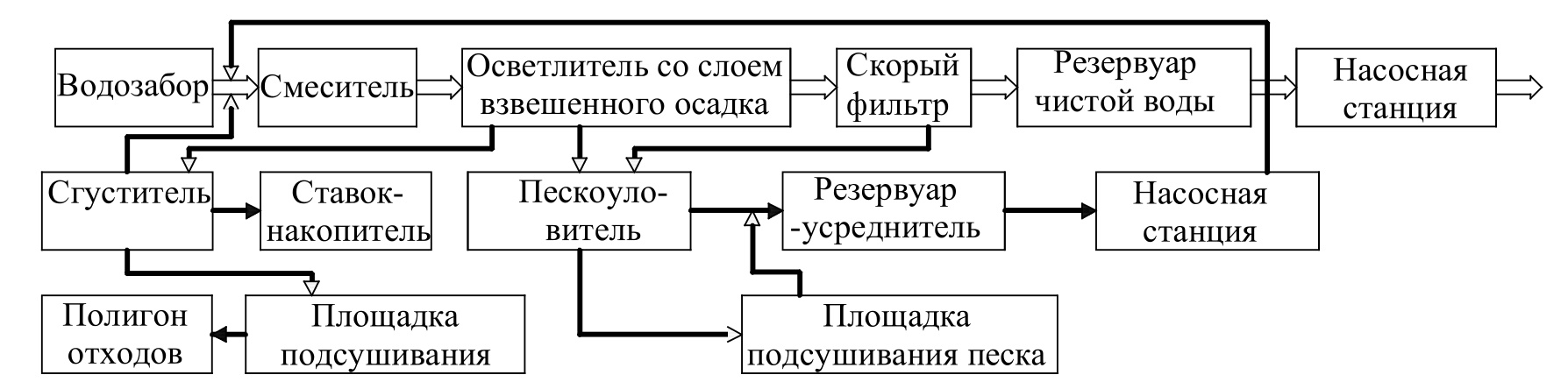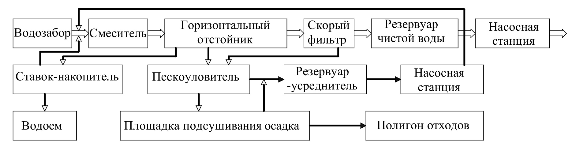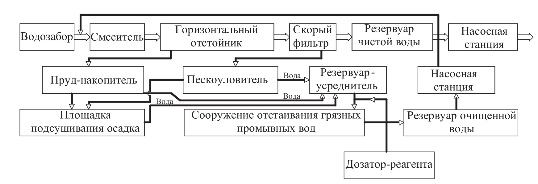 К недостаткам перечисленных типовых технологических схем следует отнести проблематичность возврата плохо очищенных промывных вод в основную технологию подготовки питьевых вод по причине их токсичности [4, 5], что приводит к огромным потерям воды. Проектируемые сооружения обработки отходов громоздки, с большой строительной стоимостью, а эксплуатационные затраты на них почти равны затратам на подготовку питьевой воды. Поэтому в практике водоканалов технологические стоки ВОС направляют в естественные или искусственные накопители-отстойники (см. рис. 1), иногда после соответствующего гигиеничного обоснования их перекачивают в смесители для повторного использования.