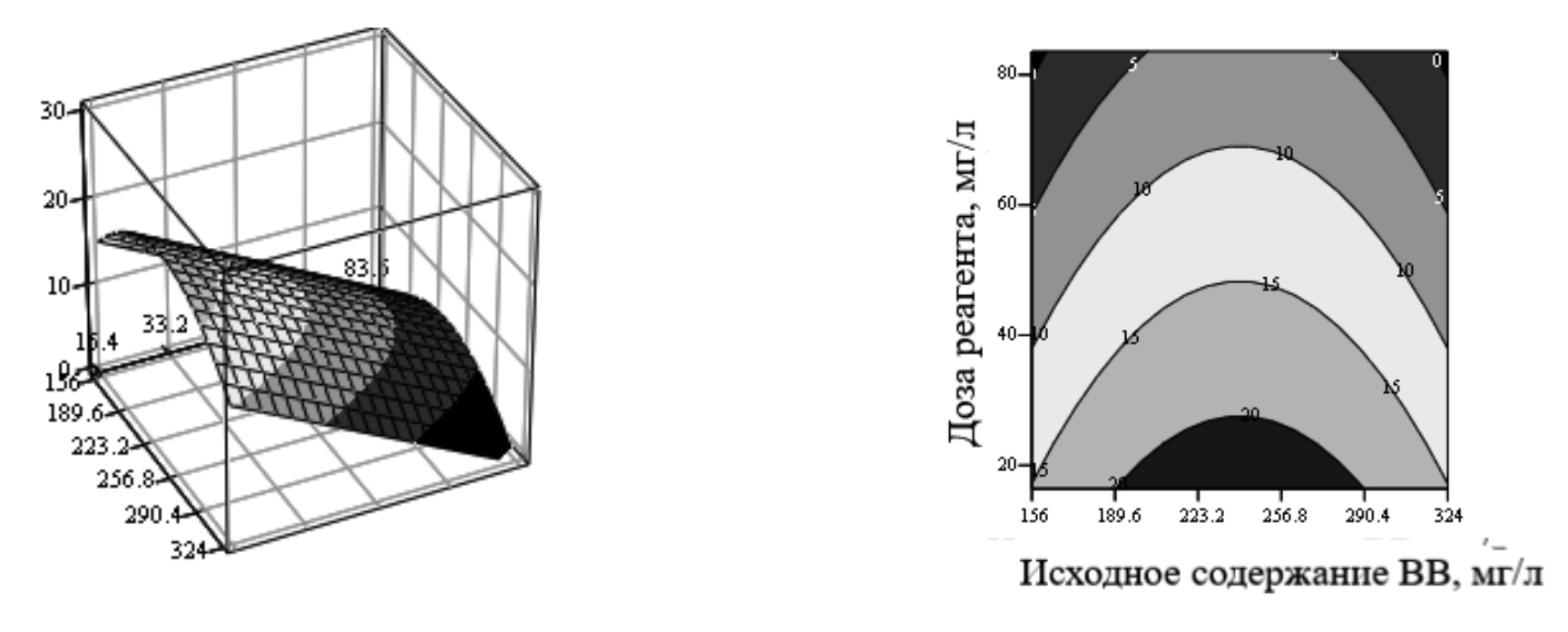 Полученное уравнение регрессии позволяет при фиксации одного из параметров, например исходного содержания взвешенных веществ, получить трехмерный график с тремя переменными, в котором варьируется на исследуемом диапазоне доза реагента и время отстаивания, а откликом является остаточное содержание взвешенных веществ. Затем, выявив наилучшие показатели, можно, зафиксировав другой показатель, например время отстаивания, получить изменения по входящему содержанию взвешенных веществ и по дозе реагента.