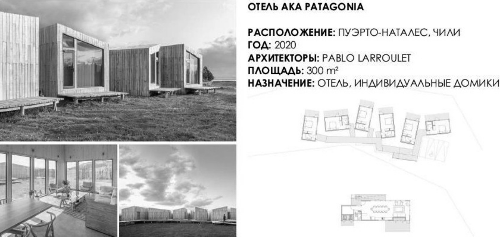 Отель AKA Patagonia (рис. 1), построенный в 2020 г. архитектурным бюро Pablo Larroulet, расположен в Пуэрто-Наталес, Чили, на верхней части склона, среди хребтов и ледников. Отель включает шесть отдельных жилых модульных зданий и один общий модуль, состоящий из гостиной и кухни. Они ориентированы окнами на окружающие природные ландшафты и максимальное естественное освещение в течение дня. Домики представляют собой отдельные двухместные номера с удобной ванной. Вся конструкция построена на сваях, чтобы оказывать минимальное воздействие на землю. Такая архитектура становится неотъемлемой частью природы [7].