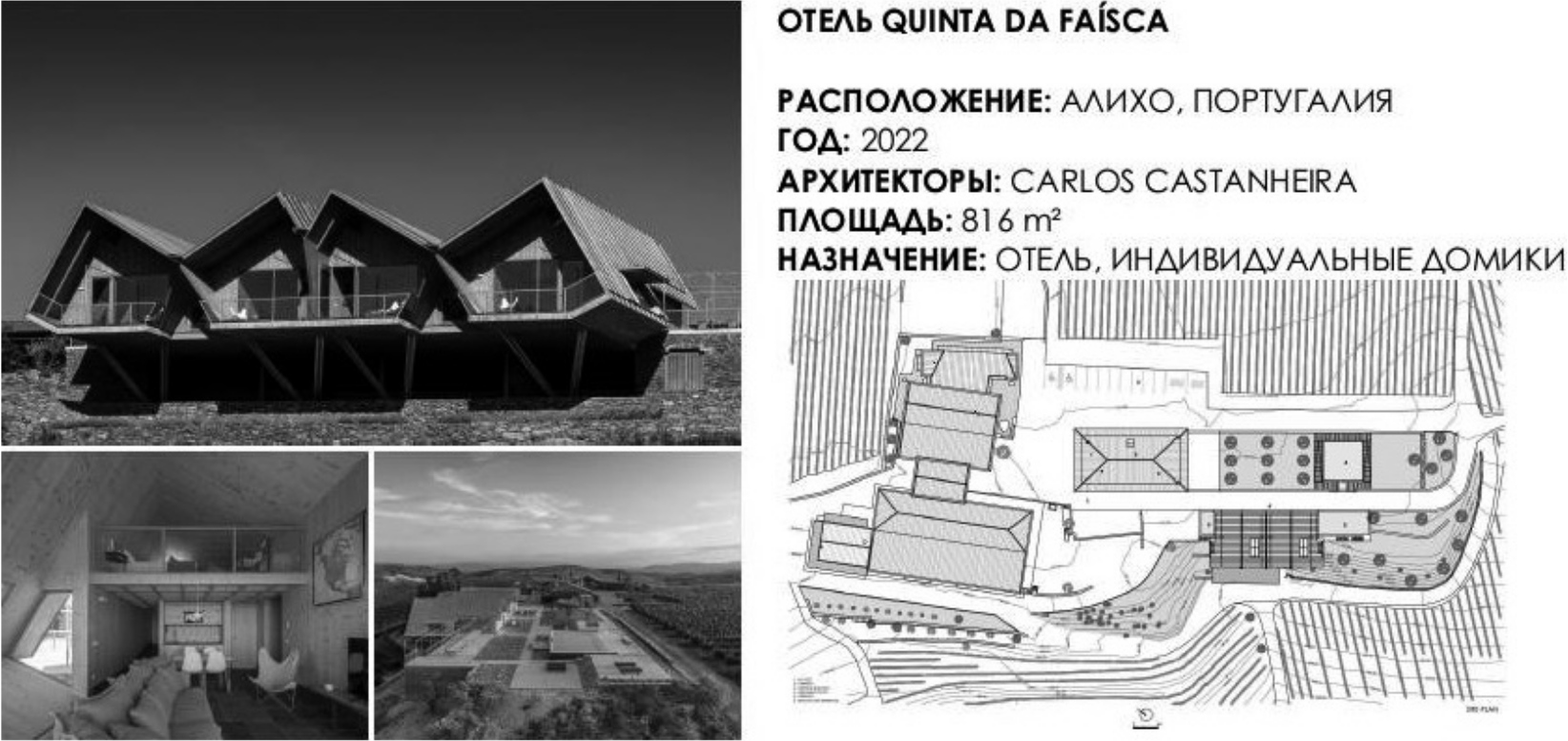 Отель Quinta Da Faísca (рис. 2), построенный архитектурным бюро Carlos Castanheira в 2022 г., находится в Алихо, Португалия. Отель представляет собой четыре отдельных жилых блока, которые могут соединяться между собой. В каждом домике над ванной и кухней есть второй этаж с кроватью, дающий второй свет гостиной, с выходом на улицу. На фасадах и в интерьере максимально использовано дерево: стеновые конструкции, потолки, окна, внешняя облицовка, также присутствуют деликатные металлические вставки [8].