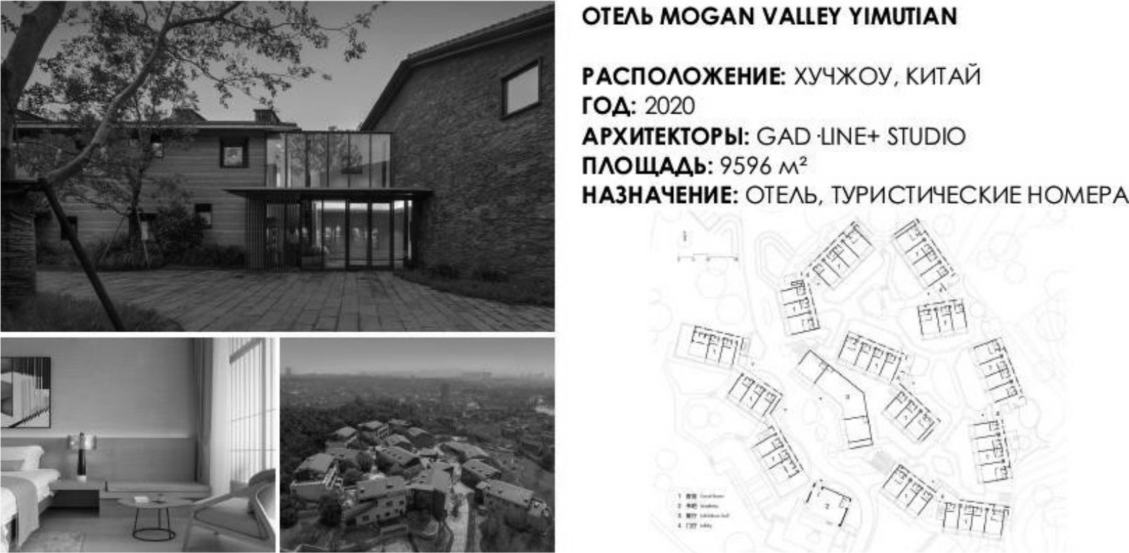 Отель Mogan Valley Yimutian (рис. 5), построенный в 2020 г. архитектурным бюро gad·line+ studio, расположен в городе Хучжоу, Китай, у восточного подножия горы Моган. Общая площадь территории – около 10000 м2. На склоне компактно расположена группа небольших зданий, включающих в себя номера для проживания и технические помещения. Ориентируясь на семейный образ жизни, планировка внутреннего пространства разнообразна, чтобы удовлетворить различные потребности каждой семьи. Отель представляет собой максимально естественную, но комфортную жилую среду. Главная цель ландшафтного дизайна – максимально сохранить естественную природную среду [11].