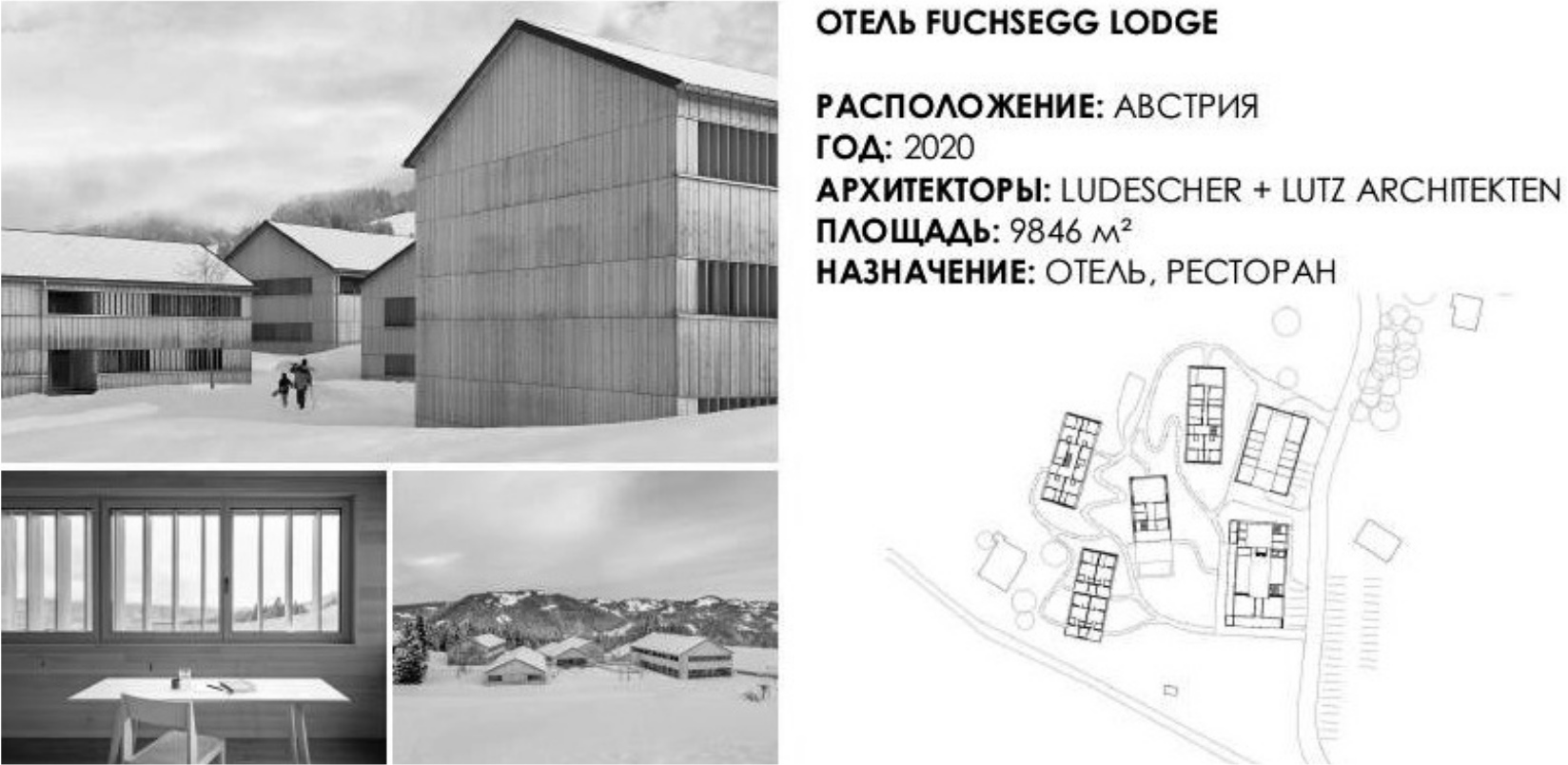 Отель Fuchsegg Lodge (рис. 7) построен в Австрии в 2020 г. архитектурным бюро Ludescher + Lutz Architekten. Основная концепция отеля – способствовать единению с природой. Здания похожи друг на друга, ориентированы по рельефу, не образуют улиц и не имеют ограждений. Этот простой, естественный дизайн вдохновлен самой окружающей природой. Авторы создали максимально комфортное пространство для отдыха и спокойной расслабленной жизни в окружении прекрасных пейзажей [13].