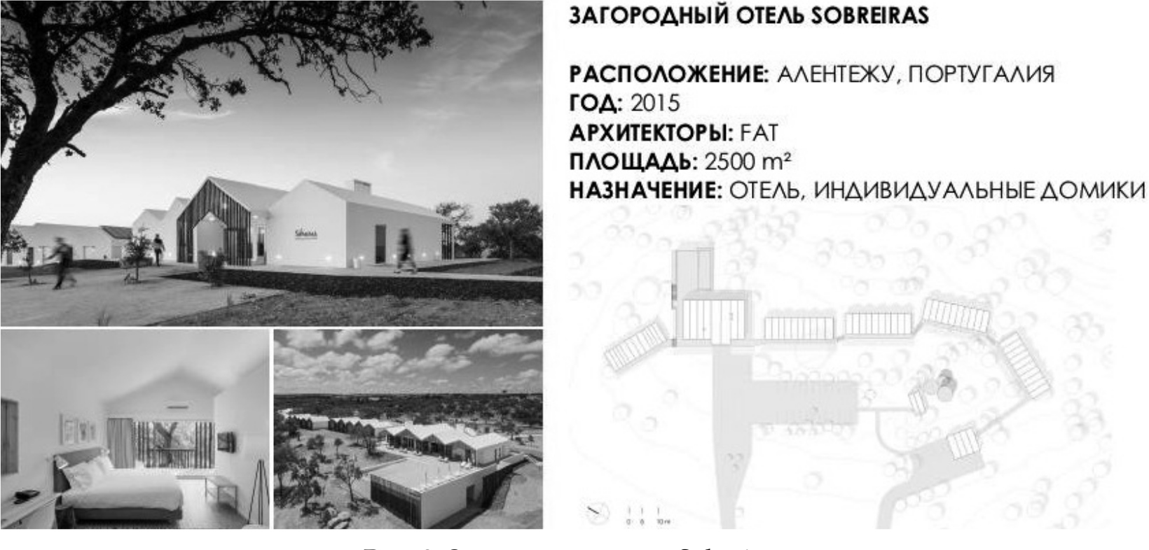 Загородный отель Sobreiras (рис. 8), построенный архитектурным бюро FAT в 2015 г., находится в Алентежу, Португалия. Участок площадью около 25 га расположен на высоте 200 м над уровнем моря среди оливковых деревьев и пышной растительности. Комплекс проектировался среди уже существующих деревьев, чтобы минимизировать вред окружающей среде. Основной главный объем, общественный, состоит из ресепшена и зоны отдыха, помещений для персонала, технических, складских и сервисных функций. Остальные здания – гостиничные номера с террасами. Дизайн отеля простой, ориентированный на местный ландшафт. Деревянные бревна на белых фасадах создают единую среду с окружающим ландшафтом. Цель проекта – сохранить и поддерживать окружающую среду, взяв ее за основу [14].