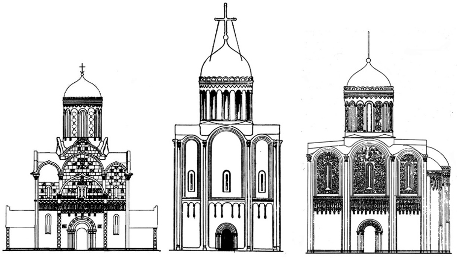 Построенные греками первые русские соборы массивны, приземисты, суровы, почти лишены декора; членения фасадов зависят только от расположения внутренних пространств; интерьеры же, где совершается литургия, просторны и украшены живописью, мозаиками, драгоценной утварью. В последующие века ритуальное пространство стало постепенно уменьшаться: мастера перенесли внимание на внешний облик храма. Меняются общие пропорции зданий: если раньше плановые габариты были примерно равны высоте, то теперь высота в два, а то и в пять раз стала больше (церковь Рождества Богородицы в Перыни. Начало XIII в., собор Покрова на Рву), особенно заметно вытягиваются барабаны. Стены и проемы обретают сложнейший пластический убор. С особенной любовью мастера разрабатывают верхнюю зону храма – ярусы изысканных трехлопастных арок и цепочки кокошников, «не нужных» ни символически, ни конструктивно.