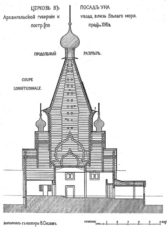 Рис. 2. Церковь в селе Уна. Обмер В. В. Суслова. Скромное внутреннее пространство церкви, ограниченное «небом», не идет в сравнение с громадностью объема