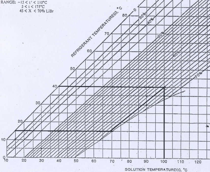 Далее производился тепловой расчет контура, где первоначально определяются давления, действующие в контуре: давление испарения, соответствующее температуре испарения, и давление конденсации, соответствующее температуре конденсации по логарифмической диаграмме log(p) – X – T для раствора бромида лития с водой. Как показано на рис. 7, при давлении конденсации выбирается точка, расположенная непосредственно перед точкой пересечения линии давления конденсации с кривой кристаллизации (чтобы гарантировать, что кристаллизации не происходит), которая представляет собой максимальную температуру вторичного генератора. В результате можно определить концентрацию раствора, выходящего из вторичного генератора, помимо его температуры, что также приводит к определению рабочего давления в основном генераторе.