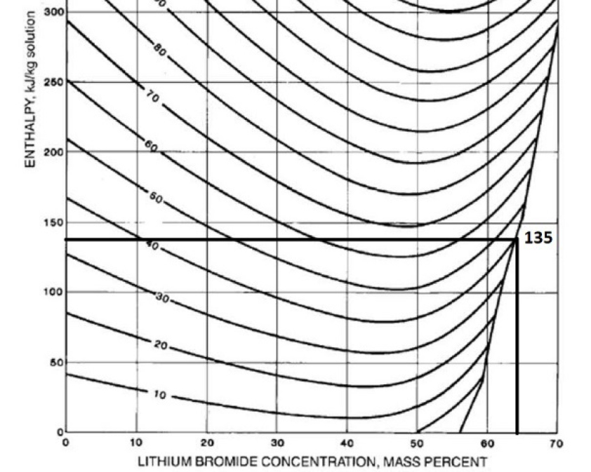Концентрация раствора, выходящего из основного генератора, составляет 58,43 % при температуре 150 °С, а концентрация раствора, выходящего из вторичного генератора, равна 66,14 %. Оба значения довольно далеки от кристаллизации в контуре, что показано на диаграмме термодинамических связей раствор бромид лития – вода (h-X-T) на рис. 9. Поскольку на линии раствора, выходящей из вторичного генератора, имеется теплообменник, раствор попадает в зону кристаллизации при температурах, превышающих 135 °С.