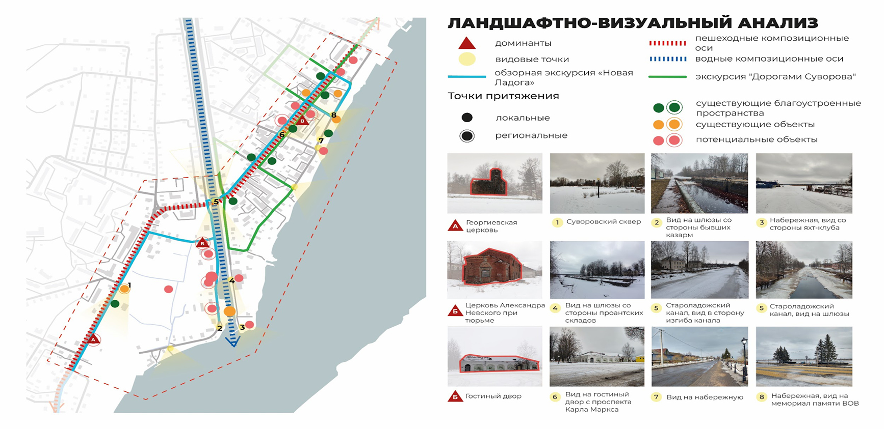 Для формирования уникального культурно-образовательного кластера города мастер-планом предлагается музыкальную, спортивную и художественную школы разместить в непосредственной близости от общеобразовательной школы, городской библиотеки, краеведческого музея и дома культуры, а также создать музей Ладожской Флотилии. Это сформирует целостную городскую среду и будет способствовать сохранению и восстановлению объектов культурного наследия, которые находятся в неудовлетворительном состоянии. На сегодняшний день в городе функционирует два дошкольных образовательных учреждения: Новоладожская средняя общеобразовательная школа имени вице-адмирала В. С. Черокова и Новоладожская детская школа искусств. К объектам культуры относятся: Центр культуры, спорта и туризма, который объединяет городскую библиотеку и Дом культуры; Отдел детского творчества Дворца детского творчества Волховского муниципального района; музей А. В. Суворова, посвящённый командованию Суздальским пехотным полком в 1763–1769 гг. и его квартированию в городе [15]. Предлагается благоустройство набережной с рядом точек притяжения, которое позволит обеспечить связную целостную систему общественных пространств общегородского и регионального уровней (рис. 8).