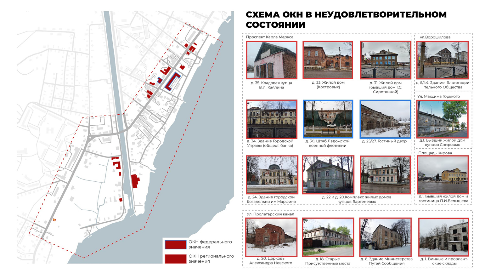 Староладожский канал не используется по назначению. Береговые линии канала и большей части набережной вдоль реки Волхов нуждаются в благоустройстве. Вдоль береговой линии выявлены землепользовательские и имущественные градостроительные конфликты. Рядом с индивидуальной жилой застройкой много самозахваченных территорий и гаражей для лодок. На историко-культурном опорном плане представлена периодичность застройки, утраченные и имеющиеся объекты культурного наследия (ОКН) различного значения, парки, сады и водные объекты. В границах исследования проанализированы ОКН, находящиеся в неудовлетворительном состоянии, с целью их реконструкции и приспособления под современное использование (рис. 2). Наиболее значимым объектом культурного наследия является Гостиный двор в центре города на площади Кирова (бывшая Торговая площадь в XVIII в.), через который проходят все туристические маршруты. В настоящее время он не эксплуатируется. Гостиный двор построен в 1835–1841 гг. по проекту архитектора Малинина и внешне схож с Гостиным двором в Санкт-Петербурге. Также к ОКН в неудовлетворительном состоянии относятся на сегодняшний день по улице Карла Маркса: Кладовая купца В.И. Каялина, д. 35; Жилой дом (Костровых), д. 33; Жилой дом (бывший дом Г.С. Сироткиной), д. 31; Здание городской управы, д. 34; Штаб Ладожской военной флотилии, д. 30; здание городской богадельни им. Марфина, д. 24; комплекс жилых домов купцов Бартеневых, д. 20, 22. По улице Пролетарский канал к ОКН в неудовлетворительном состоянии относятся: церковь Александра Невского, д. 20; старые Присутственные места, д. 18; здание Министерства путей сообщения, д. 6; винные и провиантские склады, д. 1. Также к таким объектам следует отнести здания Благотворительного фонда по ул. Ворошилова, д. 5/44; бывший жилой дом купцов Спировых по ул. Максима Горького, д. 1; бывший жилой дом и гостиница П.И. Белышева на площади Кирова, д. 1 (рис. 3).