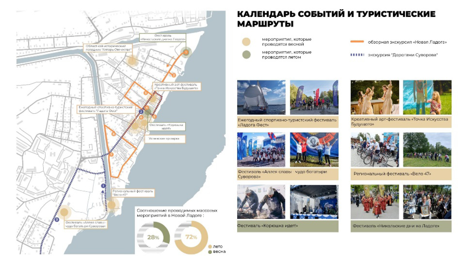 Разработан всесезонный календарь событий городского и регионального значения, который включает мероприятия, привлекательные для населения и туристов, как общего характера (зимняя спартакиада, масленица, арт-фестиваль молодых талантов и пр.), так и выявляющие идентичность среды (фестивали «Корюшка идет!», «ЛАДОГА ФЕСТ», «Никольские дни на Ладоге», «Ключевое слово «КИНО»») (рис. 6). Развитие туристической инфраструктуры, активизация культурной и событийной жизни города в соответствии с имеющимся календарем событий, реконструкция канала и благоустройство набережной, реорганизация транспортной структуры города, восстановление рыболовных традиций будут способствовать позиционированию исторического наследия города.