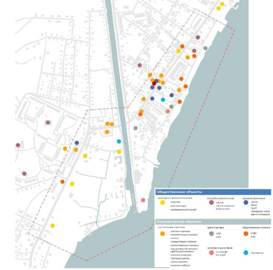 Анализ туристического потенциала выявил, что всесезонность мероприятий на рассматриваемой территории не в полной мере учтена. Самым крупным по количеству туристического потока считается фестиваль «Корюшка идёт» (рис. 4). При разработке предложений по дальнейшему пространственному развитию предлагается основываться на принципе всесезонной социальной адаптации туристско-рекреационных территорий [14]. Основная концентрация объектов инфраструктуры расположена вдоль улицы Суворова и проспекта Карла Маркса. Объектов туристко-рекреационной инфраструктуры недостаточно (рис. 5).