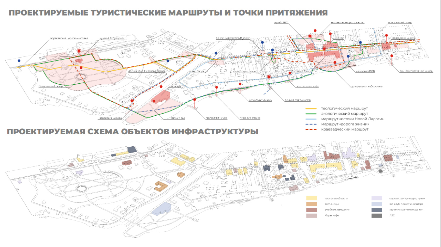 Проектируемая схема озеленения предполагает дальнейшее пространственное развитие рекреационной территории от сквера Суворова в сторону реки Чечеры. На сегодняшний день в городе имеется два небольших сквера – Молодёжный (около здания детской библиотеки) и Суворовский (около Музея Суворова). Существующее озеленение предлагается дополнить вторым ярусом кустарников, разнообразить ассортимент деревьев. Территорию за Суворовским сквером предлагается благоустроить, реку Чечера расчистить и расширить, создать парк со спортивными площадками. В здании бывших присутственных мест по адресу Пролетарский канал, 18 предполагается запроектировать гостиницу. Существующий яхт-клуб перенести в здание бывших провиантских складов, так как там есть возможность организовать место для хранения лодок, яхт и различного оборудования. Предусмотреть спуски на канал и в реку Волхов. На прилегающей к складам территории предлагается восстановить планировку исторического Летнего сада. Рядом со спортивной школой предлагается восстановить здание по адресу набережная Ладожской Флотилии, 36/2 для организации в нем общественного проката и хранения лодок. Также необходимо очистить Староладожский канал для открытия туристического маршрута и осуществить благоустройство на основе дизайн-кода территории вдоль канала. Планируемые точки притяжения и туристические маршруты с учетом существующих по проспекту Карла Маркса, по улице Суворова и вдоль набережной, а также объекты туристической инфраструктуры гостеприимства показаны на рис. 7.